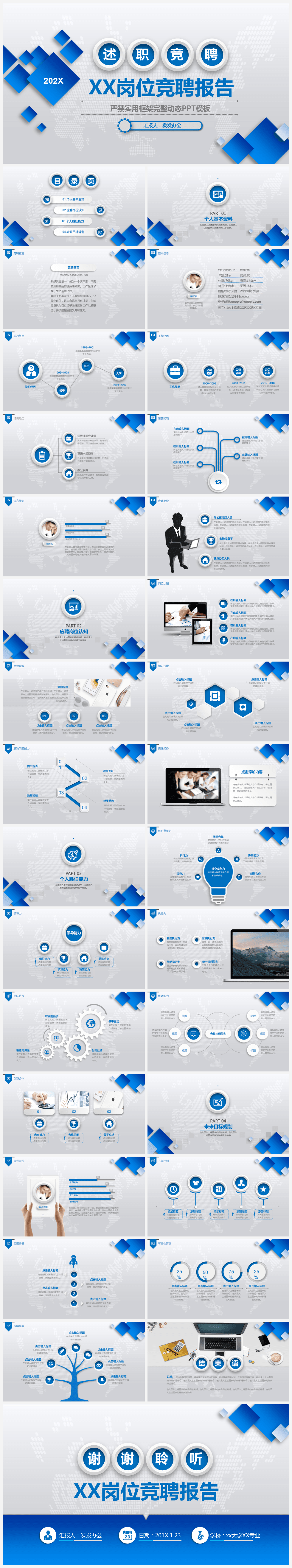 本作品内容为蓝色IOS风岗位竞聘报告述职竞聘PPT模板。 格式为 pptx, 大小12MB, 页数为32,比例自定义, 请使用软件PowerPoint打开, 作品中主体文字及图片可替换修改,文字修改可直接点击文本框进行编辑,图片更改可选中图片后单击鼠标右键选择更换图片,也可根据自身需求增加和删除作品中的内容, 源文件无水印, 欢迎使用发发资源库。