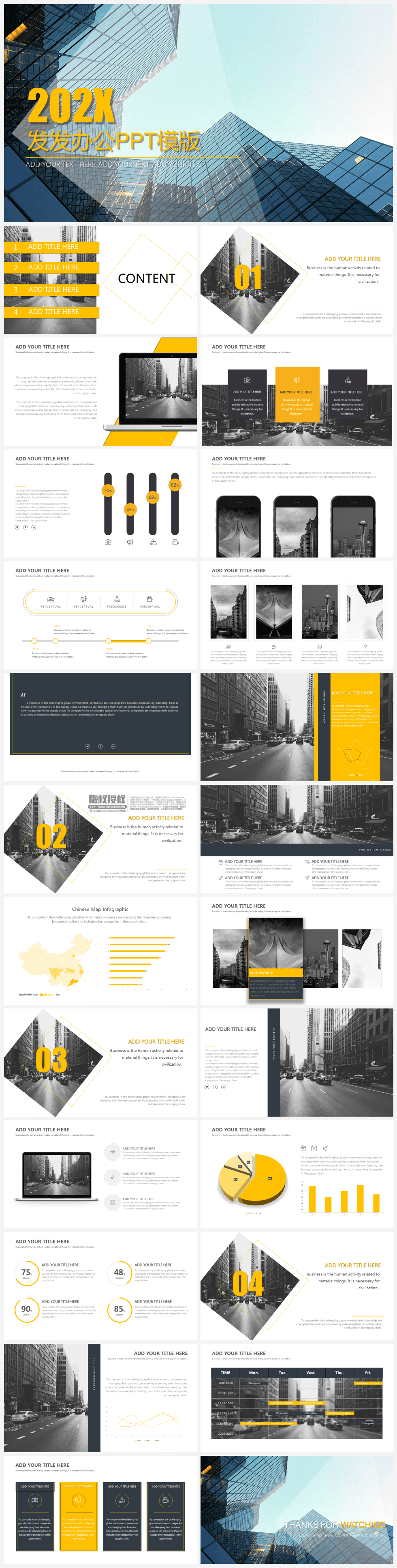 本作品内容为黄色欧美风公司介绍企业宣传PPT模板。 格式为 pptx, 大小5MB, 页数为25,比例自定义, 请使用软件PowerPoint打开, 作品中主体文字及图片可替换修改,文字修改可直接点击文本框进行编辑,图片更改可选中图片后单击鼠标右键选择更换图片,也可根据自身需求增加和删除作品中的内容, 源文件无水印, 欢迎使用发发资源库。