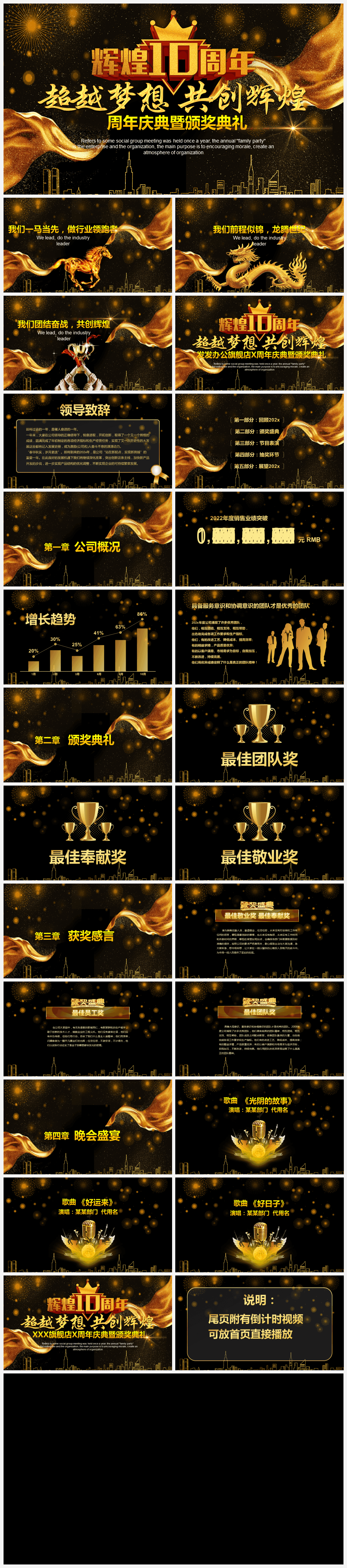 本作品内容为金色高端中国风周年庆典颁奖典礼PPT模板。 格式为 pptx, 大小18MB, 页数为26,比例自定义, 请使用软件PowerPoint打开, 作品中主体文字及图片可替换修改,文字修改可直接点击文本框进行编辑,图片更改可选中图片后单击鼠标右键选择更换图片,也可根据自身需求增加和删除作品中的内容, 源文件无水印, 欢迎使用发发资源库。