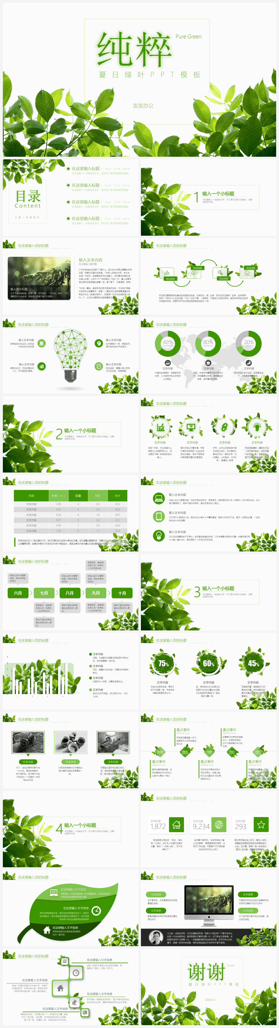本作品内容为夏日绿叶纯粹PPT模板免费下载。 格式为 pptx, 大小18MB, 页数为23,比例自定义, 请使用软件PowerPoint打开, 作品中主体文字及图片可替换修改,文字修改可直接点击文本框进行编辑,图片更改可选中图片后单击鼠标右键选择更换图片,也可根据自身需求增加和删除作品中的内容, 源文件无水印, 欢迎使用发发资源库。 资源下载此资源仅限注册用户下载,请先登录