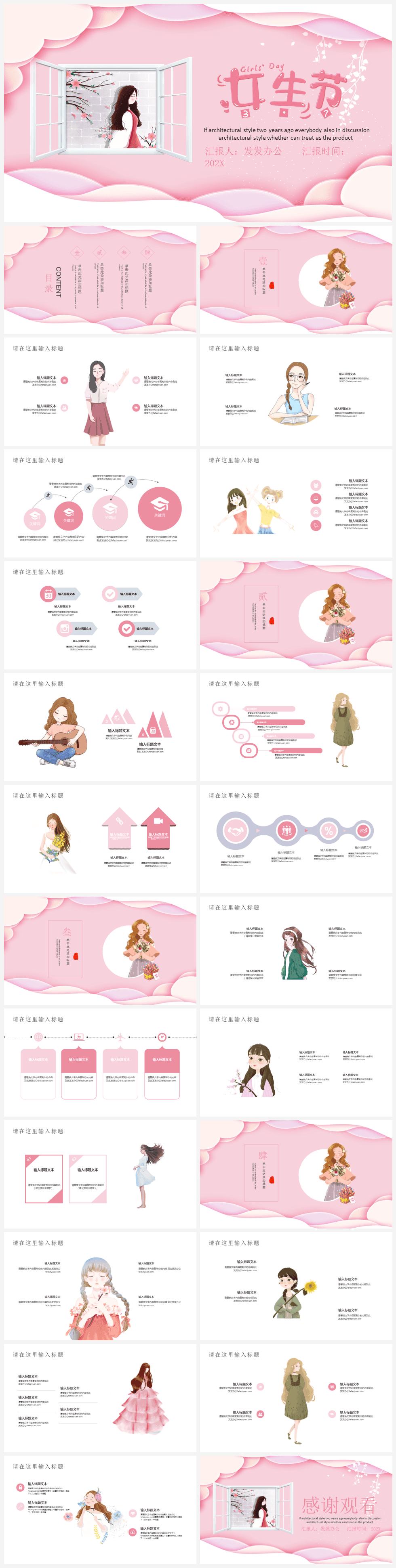 本作品内容为粉色小清新女生节节日庆典PPT模板。 格式为 pptx, 大小64MB, 页数为25,比例16:9, 请使用软件PowerPoint打开, 作品中主体文字及图片可替换修改,文字修改可直接点击文本框进行编辑,图片更改可选中图片后单击鼠标右键选择更换图片,也可根据自身需求增加和删除作品中的内容, 源文件无水印, 欢迎使用发发资源库。