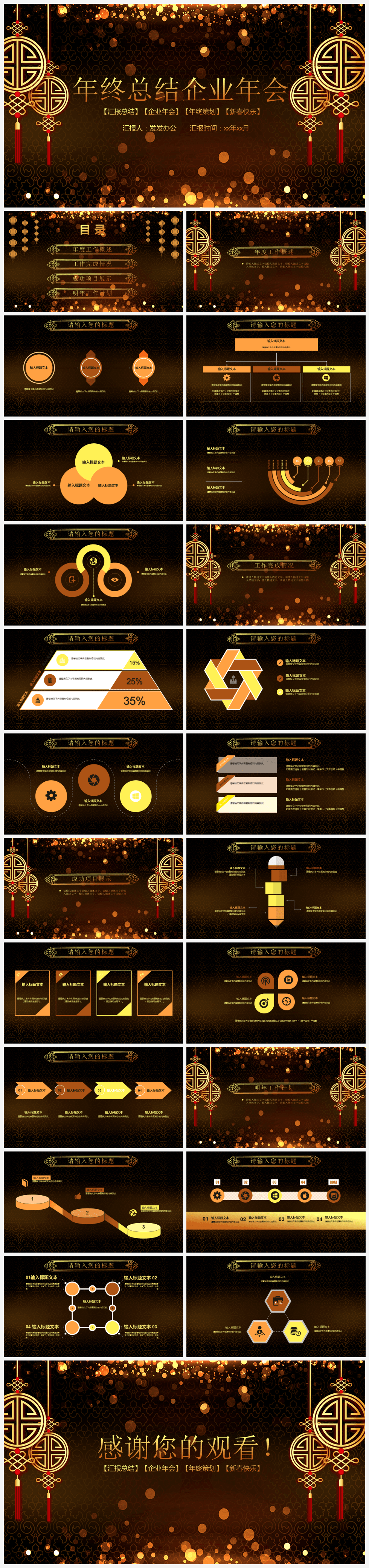 本作品内容为中国风年终总结企业年会PPT模板。 格式为 pptx, 大小8MB, 页数为24,比例自定义, 请使用软件PowerPoint打开, 作品中主体文字及图片可替换修改,文字修改可直接点击文本框进行编辑,图片更改可选中图片后单击鼠标右键选择更换图片,也可根据自身需求增加和删除作品中的内容, 源文件无水印, 欢迎使用发发资源库。