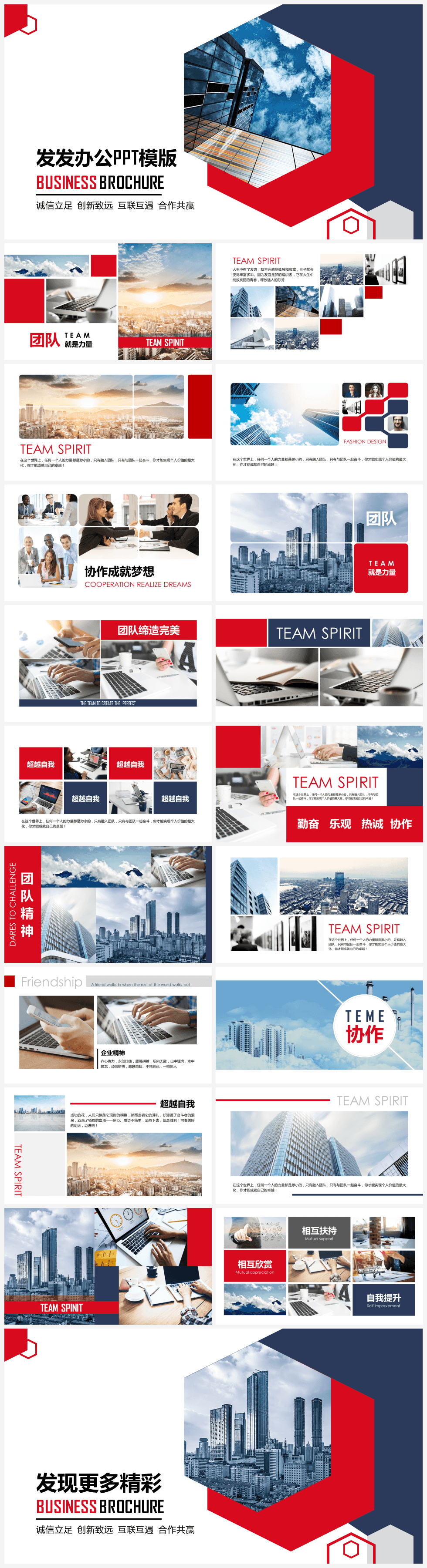 本作品内容为欧美风企业宣传商务画册PPT模板。 格式为 pptx, 大小21MB, 页数为20,比例16:9, 请使用软件PowerPoint打开, 作品中主体文字及图片可替换修改,文字修改可直接点击文本框进行编辑,图片更改可选中图片后单击鼠标右键选择更换图片,也可根据自身需求增加和删除作品中的内容, 源文件无水印, 欢迎使用发发资源库。