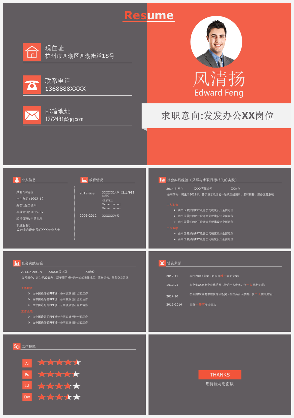 本作品内容为大气简约风岗位竞聘个人简历求职应聘PPT模板免费下载。 格式为 pptx, 大小2MB, 页数为7,比例自定义, 请使用软件PowerPoint打开, 作品中主体文字及图片可替换修改,文字修改可直接点击文本框进行编辑,图片更改可选中图片后单击鼠标右键选择更换图片,也可根据自身需求增加和删除作品中的内容, 源文件无水印, 欢迎使用发发资源库。 资源下载此资源仅限注册用户下载,请先登录