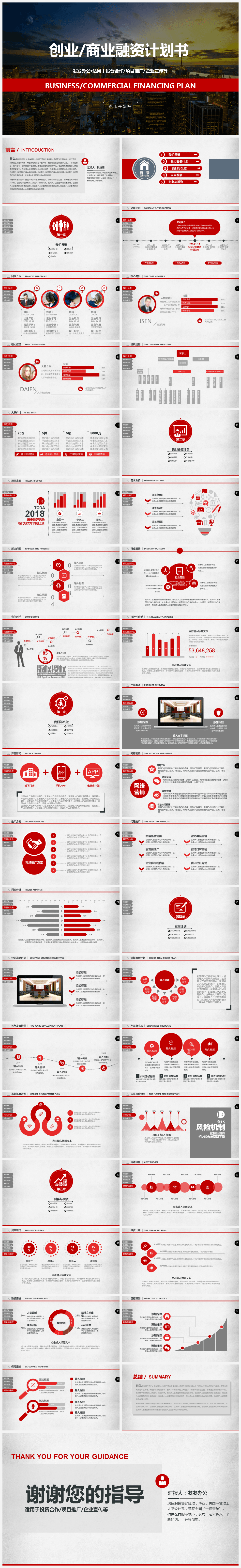 本作品内容为红色欧美风创业商业融资计划书PPT模板。 格式为 pptx, 大小8MB, 页数为40,比例16:9, 请使用软件PowerPoint打开, 作品中主体文字及图片可替换修改,文字修改可直接点击文本框进行编辑,图片更改可选中图片后单击鼠标右键选择更换图片,也可根据自身需求增加和删除作品中的内容, 源文件无水印, 欢迎使用发发资源库。 资源下载此资源下载价格为8.8F币,VIP免费,请先登录
