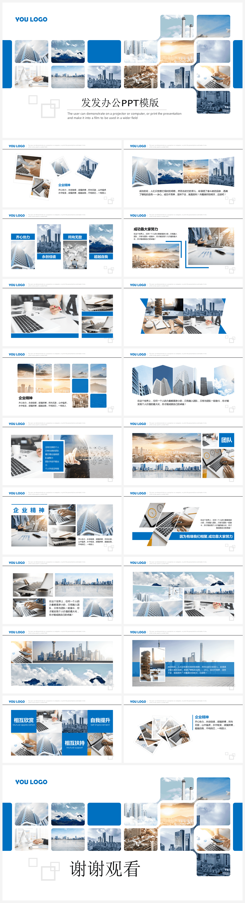 本作品内容为蓝色欧美风公司文化宣传企业相册展示PPT模板。 格式为 pptx, 大小21MB, 页数为20,比例16:9, 请使用软件PowerPoint打开, 作品中主体文字及图片可替换修改,文字修改可直接点击文本框进行编辑,图片更改可选中图片后单击鼠标右键选择更换图片,也可根据自身需求增加和删除作品中的内容, 源文件无水印, 欢迎使用发发资源库。
