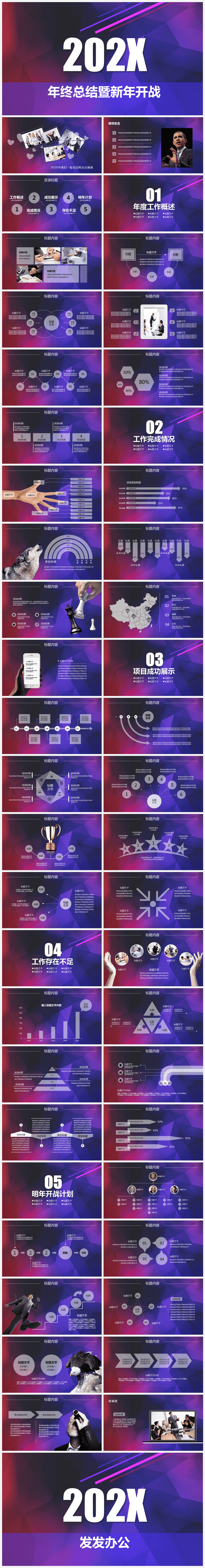 本作品内容为紫色欧美风年终总结及工作汇报PPT模板。 格式为 pptx, 大小19MB, 页数为48,比例16:9, 请使用软件PowerPoint打开, 作品中主体文字及图片可替换修改,文字修改可直接点击文本框进行编辑,图片更改可选中图片后单击鼠标右键选择更换图片,也可根据自身需求增加和删除作品中的内容, 源文件无水印, 欢迎使用发发资源库。