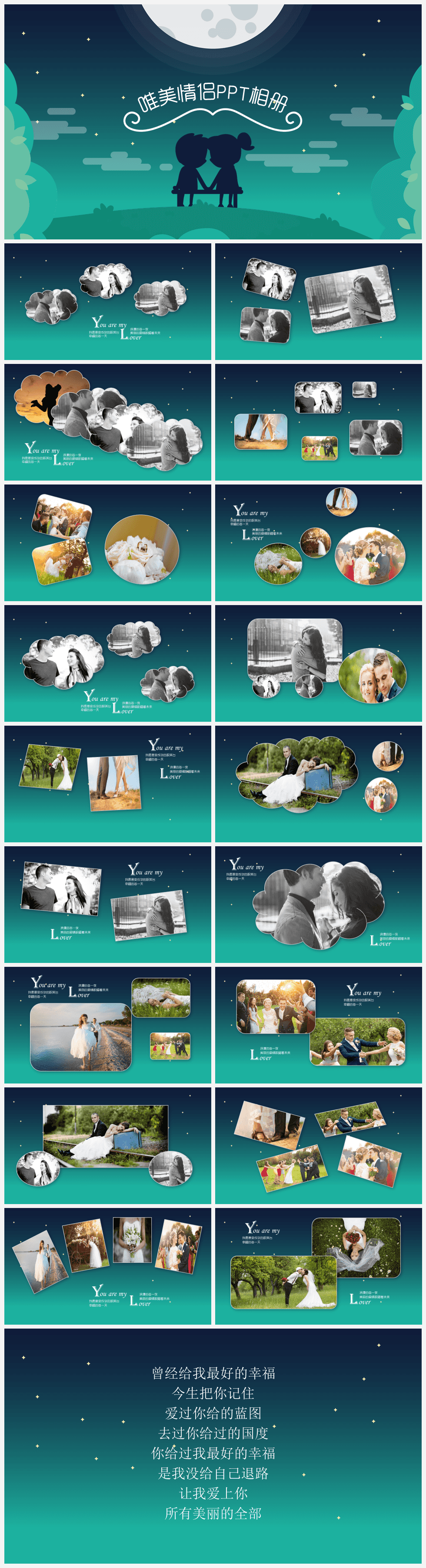 本作品内容为翡翠色唯美情侣PPT相册。 格式为 pptx, 大小24MB, 页数为20,比例自定义, 请使用软件PowerPoint打开, 作品中主体文字及图片可替换修改,文字修改可直接点击文本框进行编辑,图片更改可选中图片后单击鼠标右键选择更换图片,也可根据自身需求增加和删除作品中的内容, 源文件无水印, 欢迎使用发发资源库。 资源下载此资源下载价格为8.8F币,VIP免费,请先登录