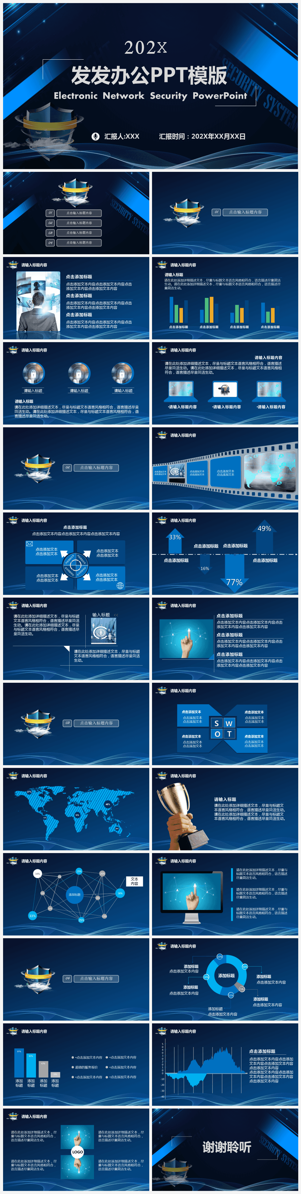 本作品内容为蓝色欧美风述职报告商务PPT模板免费下载。 格式为 pptx, 大小5MB, 页数为25,比例16:9, 请使用软件PowerPoint打开, 作品中主体文字及图片可替换修改,文字修改可直接点击文本框进行编辑,图片更改可选中图片后单击鼠标右键选择更换图片,也可根据自身需求增加和删除作品中的内容, 源文件无水印, 欢迎使用发发资源库。 资源下载此资源下载价格为8.8F币,VIP免费,请先登录