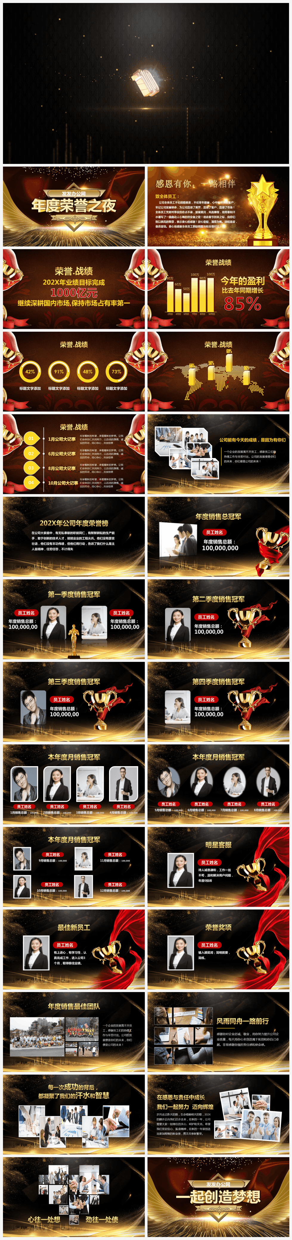 本作品内容为高端企业年度荣誉之夜PPT模板。 格式为 pptx, 大小49MB, 页数为27,比例自定义, 请使用软件PowerPoint打开, 作品中主体文字及图片可替换修改,文字修改可直接点击文本框进行编辑,图片更改可选中图片后单击鼠标右键选择更换图片,也可根据自身需求增加和删除作品中的内容, 源文件无水印, 欢迎使用发发资源库。