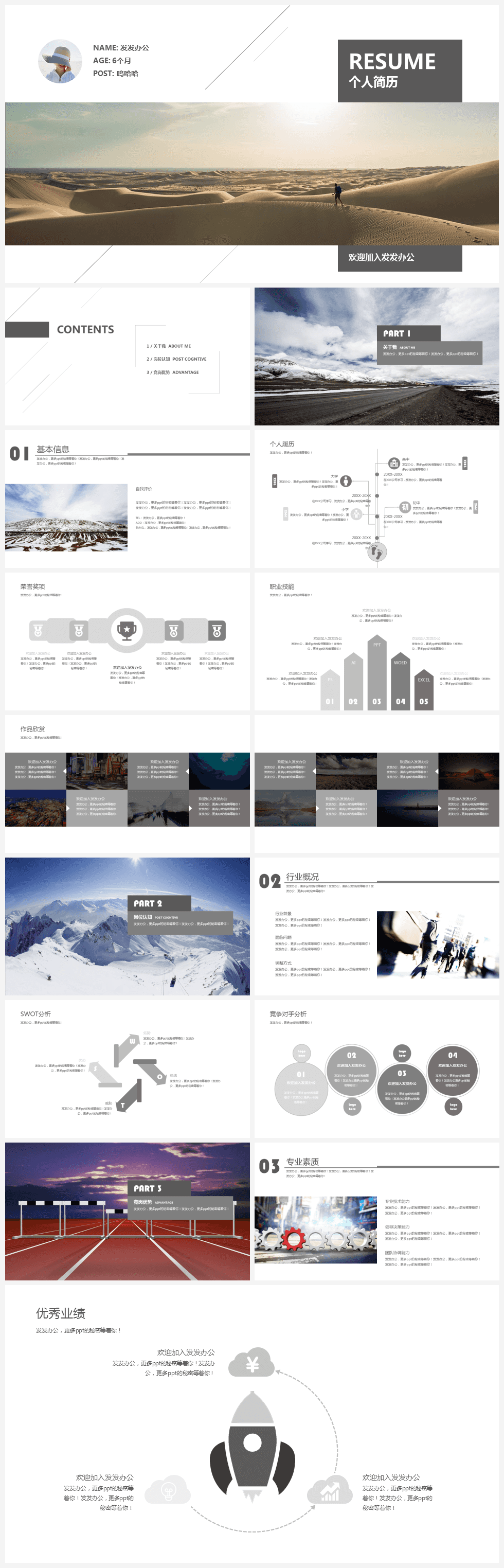 本作品内容为大气简约风个人简历岗位竞聘PPT模板免费下载。 格式为 pptx, 大小10MB, 页数为16,比例自定义, 请使用软件PowerPoint打开, 作品中主体文字及图片可替换修改,文字修改可直接点击文本框进行编辑,图片更改可选中图片后单击鼠标右键选择更换图片,也可根据自身需求增加和删除作品中的内容, 源文件无水印, 欢迎使用发发资源库。 资源下载此资源仅限注册用户下载,请先登录