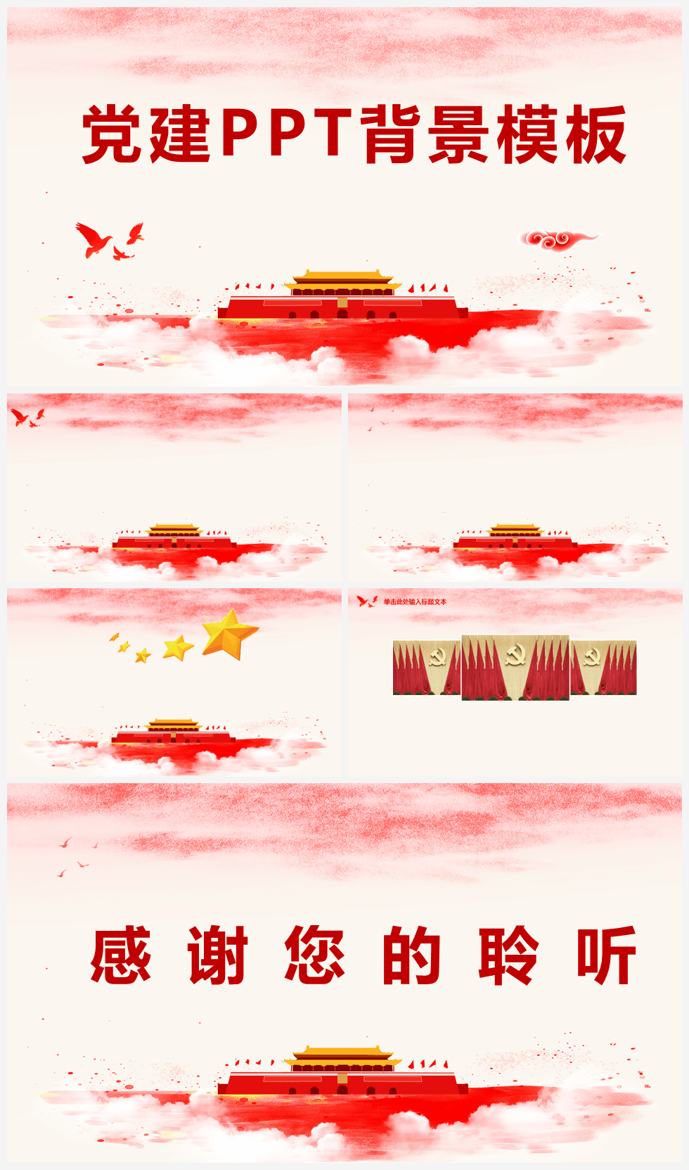 本作品内容为红色中国风党建PPT背景模板。 格式为 pptx, 大小7MB, 页数为6,比例自定义, 请使用软件PowerPoint打开, 作品中主体文字及图片可替换修改,文字修改可直接点击文本框进行编辑,图片更改可选中图片后单击鼠标右键选择更换图片,也可根据自身需求增加和删除作品中的内容, 源文件无水印, 欢迎使用发发资源库。