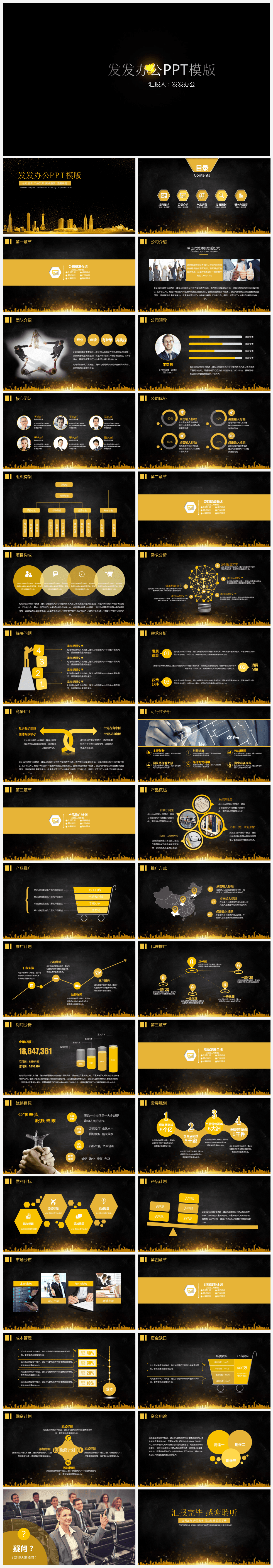 本作品内容为高端欧美风公司宣传产品发布PPT模板。 格式为 pptx, 大小33MB, 页数为37,比例自定义, 请使用软件PowerPoint打开, 作品中主体文字及图片可替换修改,文字修改可直接点击文本框进行编辑,图片更改可选中图片后单击鼠标右键选择更换图片,也可根据自身需求增加和删除作品中的内容, 源文件无水印, 欢迎使用发发资源库。
