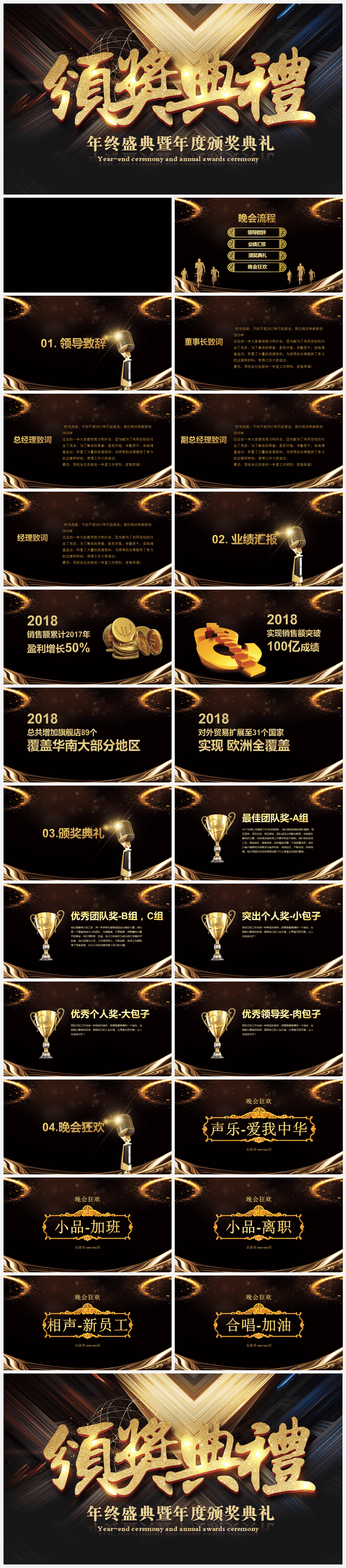 本作品内容为高端年终盛典暨年度颁奖典礼PPT模板。 格式为 pptx, 大小22MB, 页数为26,比例自定义, 请使用软件PowerPoint打开, 作品中主体文字及图片可替换修改,文字修改可直接点击文本框进行编辑,图片更改可选中图片后单击鼠标右键选择更换图片,也可根据自身需求增加和删除作品中的内容, 源文件无水印, 欢迎使用发发资源库。