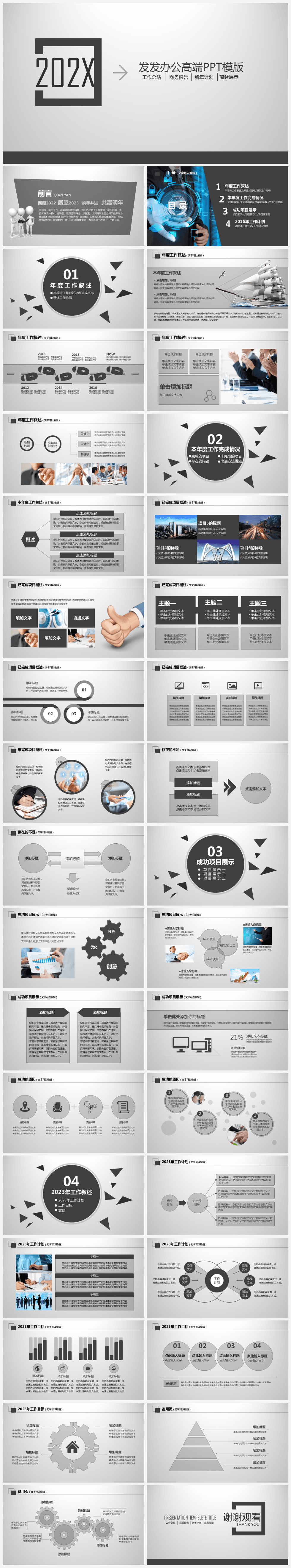 本作品内容为灰色欧美风商务报告新年计划PPT模板。 格式为 pptx, 大小7MB, 页数为35,比例自定义, 请使用软件PowerPoint打开, 作品中主体文字及图片可替换修改,文字修改可直接点击文本框进行编辑,图片更改可选中图片后单击鼠标右键选择更换图片,也可根据自身需求增加和删除作品中的内容, 源文件无水印, 欢迎使用发发资源库。 资源下载此资源下载价格为8.8F币,VIP免费,请先登录
