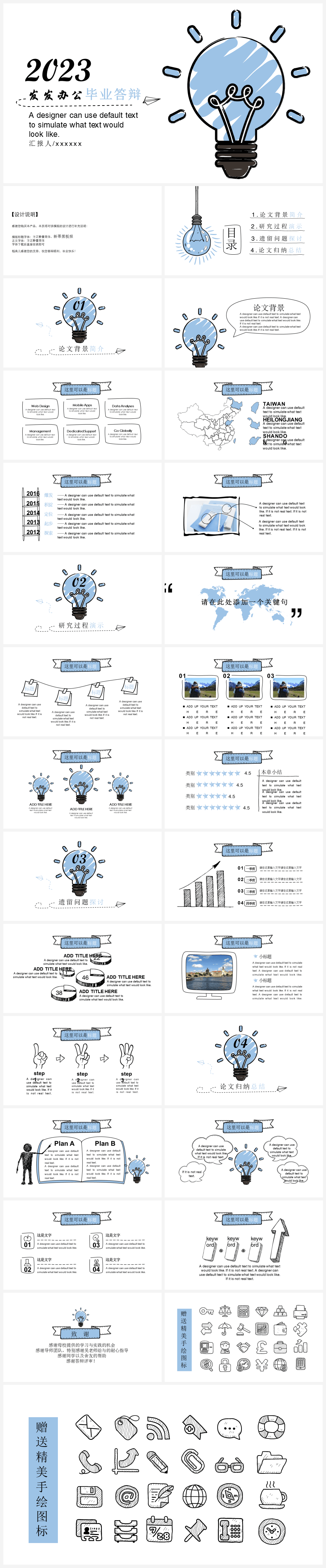 本作品内容为水彩手绘风灯泡背景图毕业答辩PPT模板。 格式为 pptx, 大小4MB, 页数为28,比例自定义, 请使用软件PowerPoint打开, 作品中主体文字及图片可替换修改,文字修改可直接点击文本框进行编辑,图片更改可选中图片后单击鼠标右键选择更换图片,也可根据自身需求增加和删除作品中的内容, 源文件无水印, 欢迎使用发发资源库。 资源下载此资源下载价格为8.8F币,VIP免费,请先登录