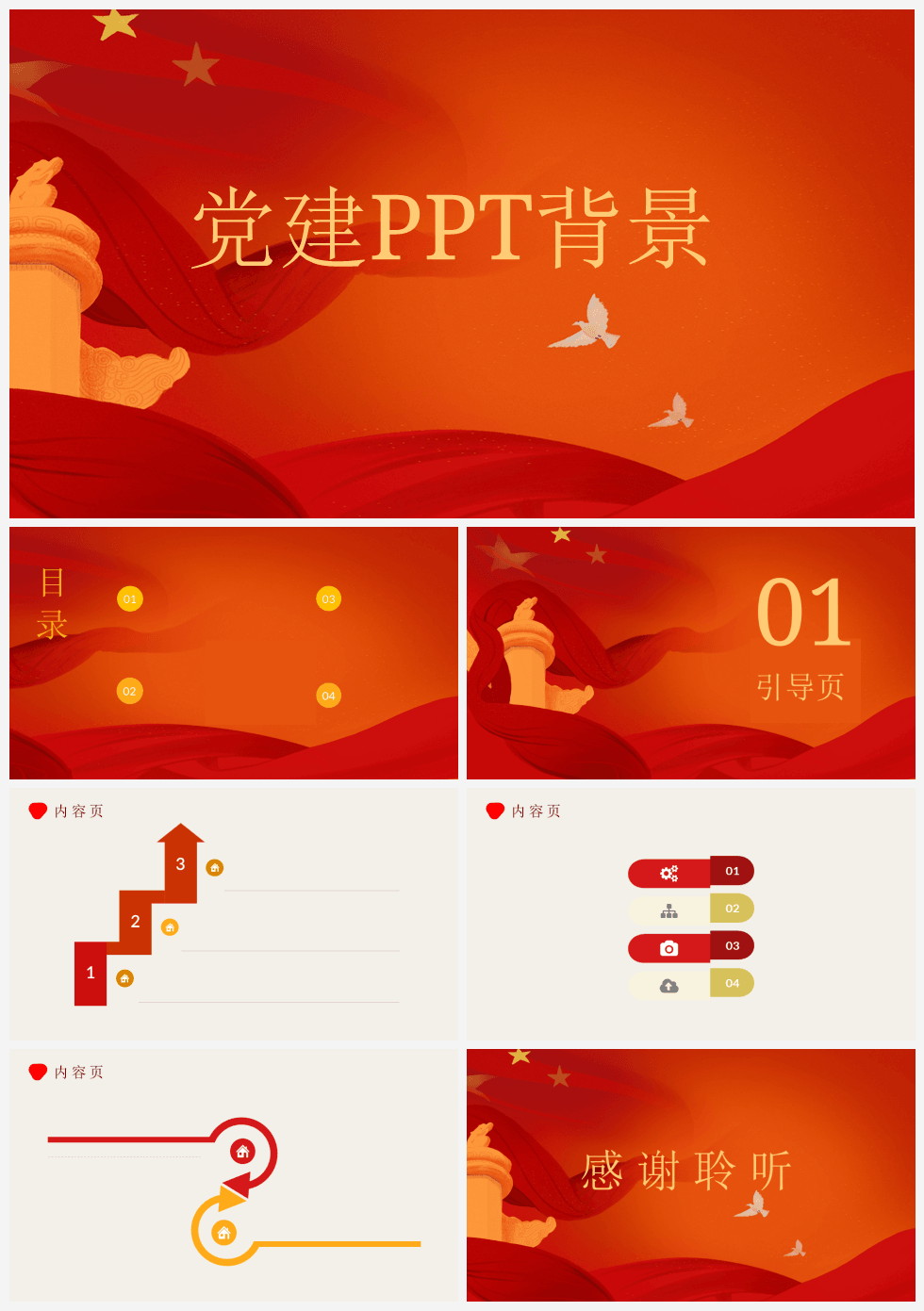 本作品内容为红色中国风国旗和平鸽背景图党建PPT背景模板。 格式为 pptx, 大小4MB, 页数为7,比例自定义, 请使用软件PowerPoint打开, 作品中主体文字及图片可替换修改,文字修改可直接点击文本框进行编辑,图片更改可选中图片后单击鼠标右键选择更换图片,也可根据自身需求增加和删除作品中的内容, 源文件无水印, 欢迎使用发发资源库。