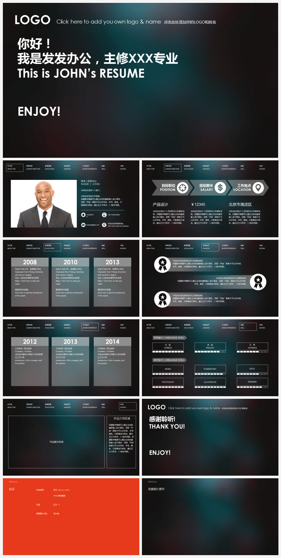 本作品内容为磨砂背景IOS风个人简历PPT模板免费下载。 格式为 pptx, 大小1MB, 页数为11,比例16:9, 请使用软件PowerPoint打开, 作品中主体文字及图片可替换修改,文字修改可直接点击文本框进行编辑,图片更改可选中图片后单击鼠标右键选择更换图片,也可根据自身需求增加和删除作品中的内容, 源文件无水印, 欢迎使用发发资源库。 资源下载此资源仅限注册用户下载,请先登录