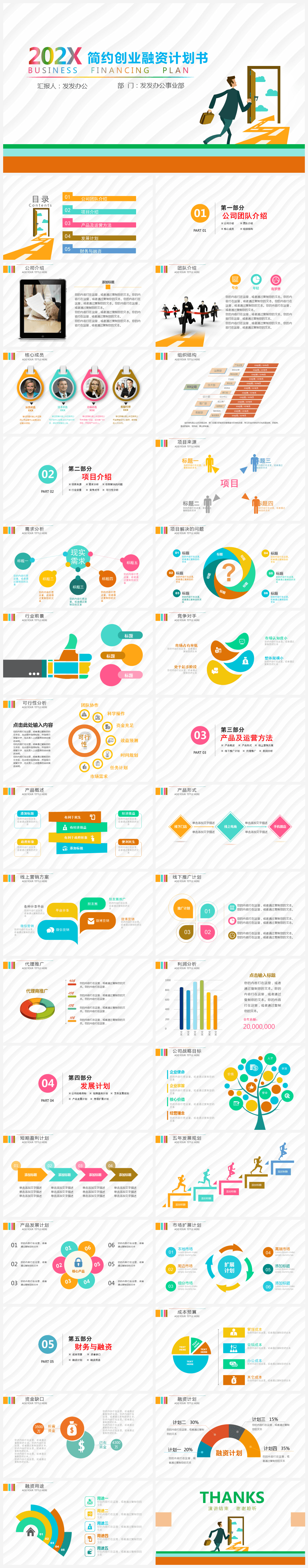 本作品内容为多彩商务简约风创业融资计划书PPT模板。 格式为 pptx, 大小8MB, 页数为33,比例自定义, 请使用软件PowerPoint打开, 作品中主体文字及图片可替换修改,文字修改可直接点击文本框进行编辑,图片更改可选中图片后单击鼠标右键选择更换图片,也可根据自身需求增加和删除作品中的内容, 源文件无水印, 欢迎使用发发资源库。