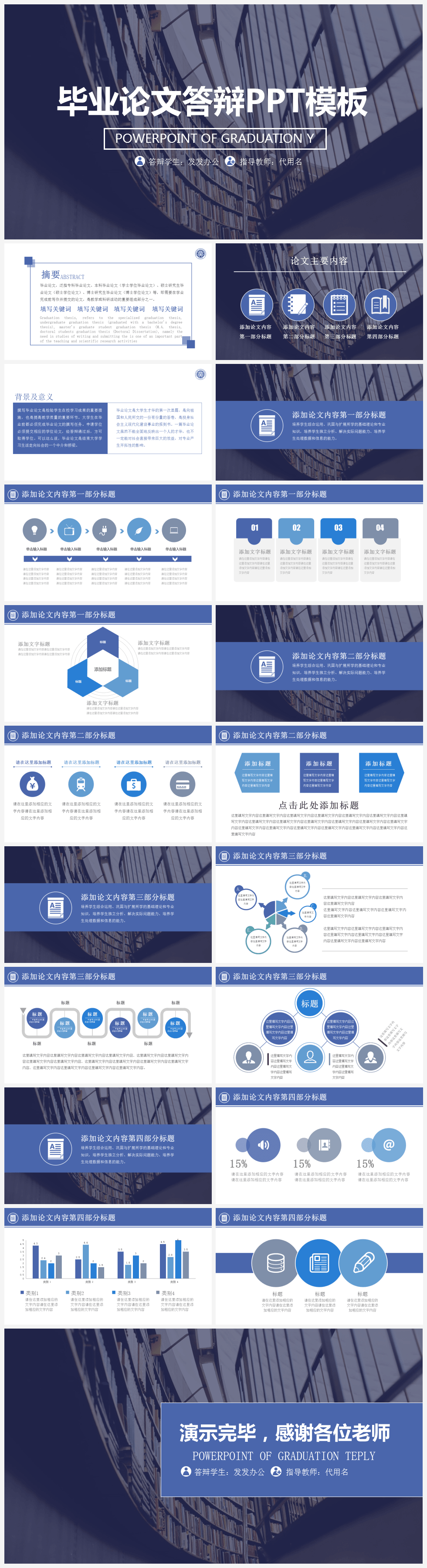 本作品内容为蓝色简约风开题报告毕业论文答辩PPT模板。 格式为 pptx, 大小2MB, 页数为20,比例自定义, 请使用软件PowerPoint打开, 作品中主体文字及图片可替换修改,文字修改可直接点击文本框进行编辑,图片更改可选中图片后单击鼠标右键选择更换图片,也可根据自身需求增加和删除作品中的内容, 源文件无水印, 欢迎使用发发资源库。