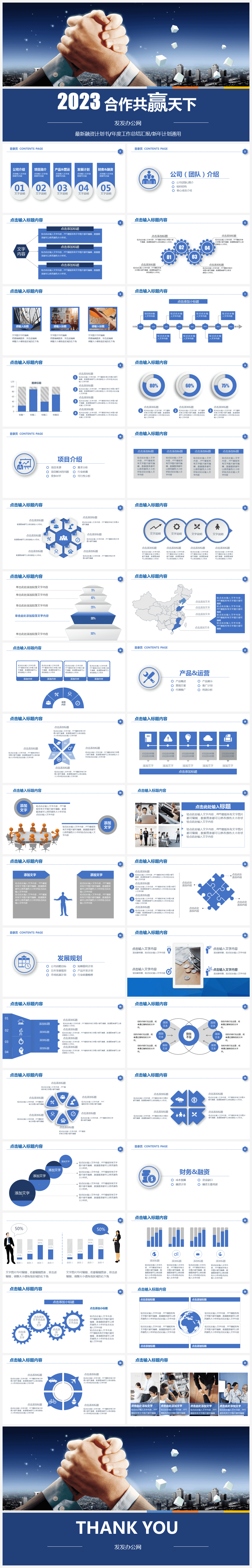 本作品内容为蓝色商务简约风最新融资计划书PPT模板。 格式为 pptx, 大小3MB, 页数为38,比例16:9, 请使用软件PowerPoint打开, 作品中主体文字及图片可替换修改,文字修改可直接点击文本框进行编辑,图片更改可选中图片后单击鼠标右键选择更换图片,也可根据自身需求增加和删除作品中的内容, 源文件无水印, 欢迎使用发发资源库。