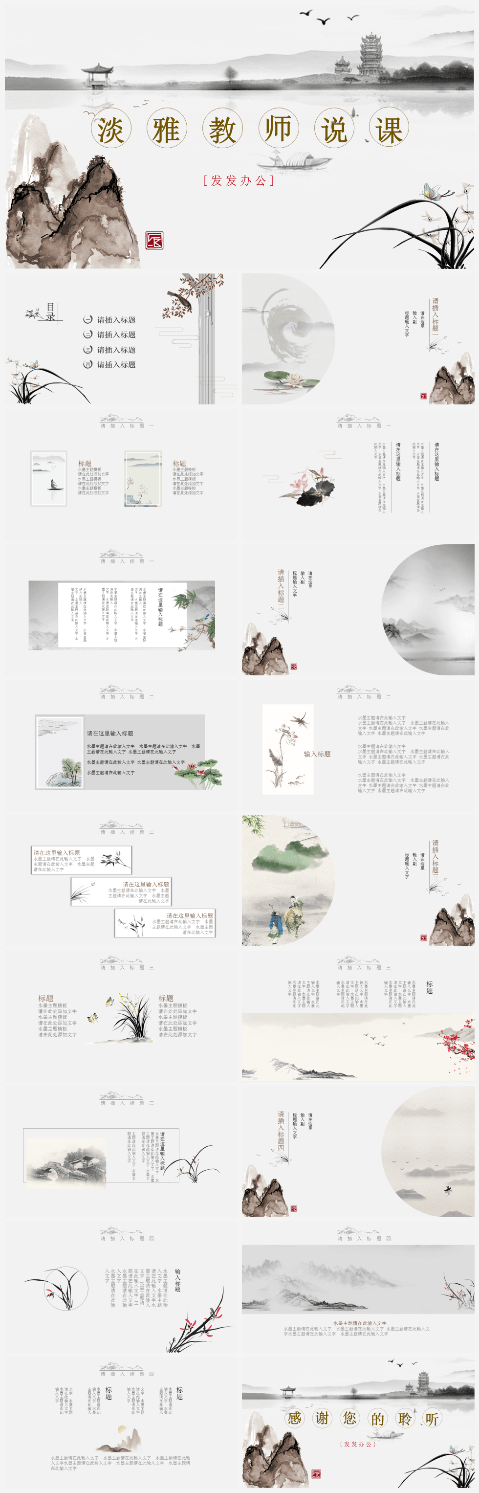 本作品内容为复古风水墨主题淡雅教师说课PPT模板。 格式为 pptx, 大小5MB, 页数为19,比例自定义, 请使用软件PowerPoint打开, 作品中主体文字及图片可替换修改,文字修改可直接点击文本框进行编辑,图片更改可选中图片后单击鼠标右键选择更换图片,也可根据自身需求增加和删除作品中的内容, 源文件无水印, 欢迎使用发发资源库。