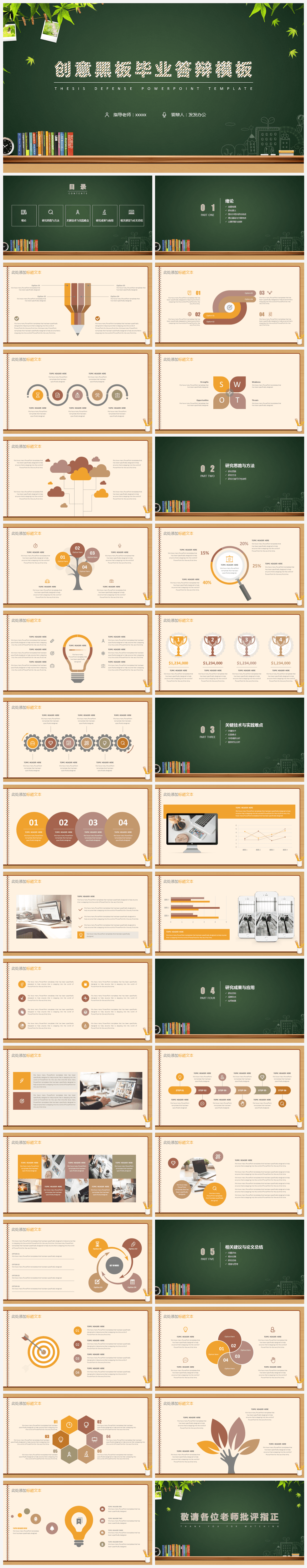 本作品内容为创意黑板风毕业答辩PPT模板。 格式为 pptx, 大小3MB, 页数为33,比例16:9, 请使用软件PowerPoint打开, 作品中主体文字及图片可替换修改,文字修改可直接点击文本框进行编辑,图片更改可选中图片后单击鼠标右键选择更换图片,也可根据自身需求增加和删除作品中的内容, 源文件无水印, 欢迎使用发发资源库。 资源下载此资源下载价格为8.8F币,VIP免费,请先登录
