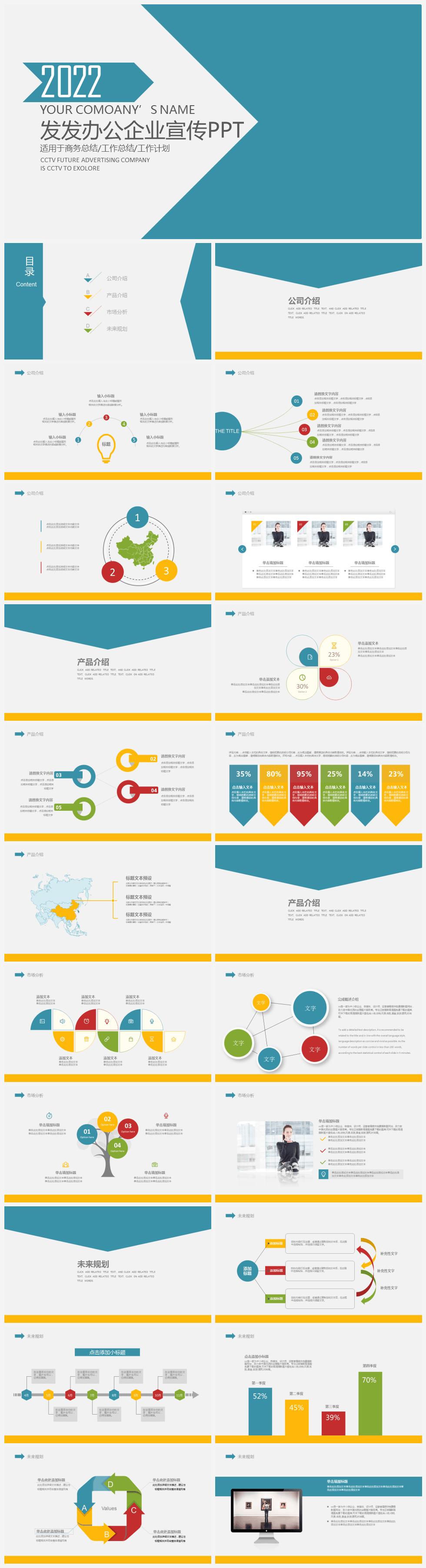 本作品内容为大气商务简约风企业宣传PPT模板。 格式为 pptx, 大小6MB, 页数为23,比例16:9, 请使用软件PowerPoint打开, 作品中主体文字及图片可替换修改,文字修改可直接点击文本框进行编辑,图片更改可选中图片后单击鼠标右键选择更换图片,也可根据自身需求增加和删除作品中的内容, 源文件无水印, 欢迎使用发发资源库。