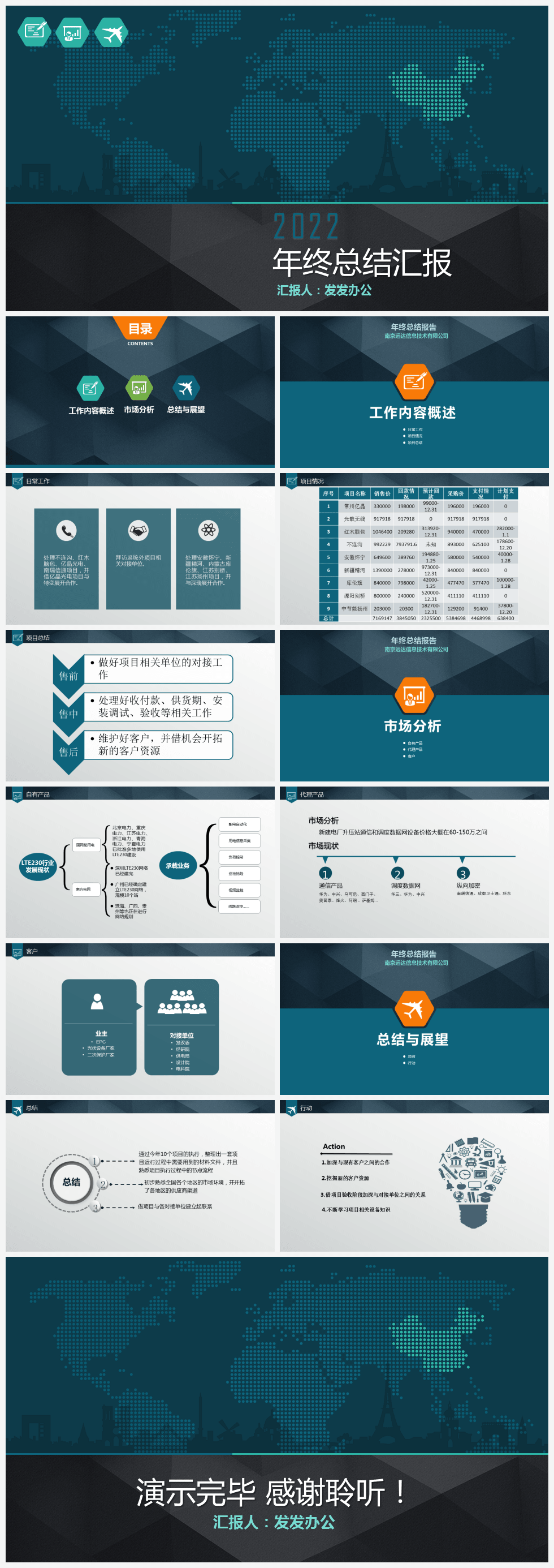本作品内容为蓝色商务简约风年终总结汇报PPT模板。 格式为 pptx, 大小4MB, 页数为14,比例16:9, 请使用软件PowerPoint打开, 作品中主体文字及图片可替换修改,文字修改可直接点击文本框进行编辑,图片更改可选中图片后单击鼠标右键选择更换图片,也可根据自身需求增加和删除作品中的内容, 源文件无水印, 欢迎使用发发资源库。