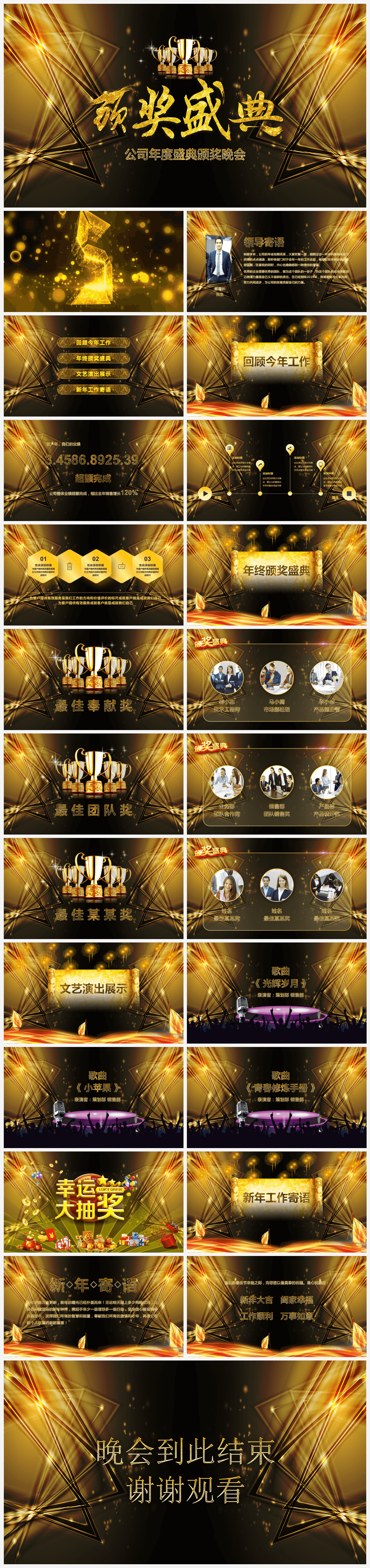 本作品内容为大气金色创意公司年度盛典颁奖晚会PPT模板。 格式为 pptx, 大小85MB, 页数为24,比例自定义, 请使用软件PowerPoint打开, 作品中主体文字及图片可替换修改,文字修改可直接点击文本框进行编辑,图片更改可选中图片后单击鼠标右键选择更换图片,也可根据自身需求增加和删除作品中的内容, 源文件无水印, 欢迎使用发发资源库。 资源下载此资源下载价格为8.8F币,VIP免费,请先登录