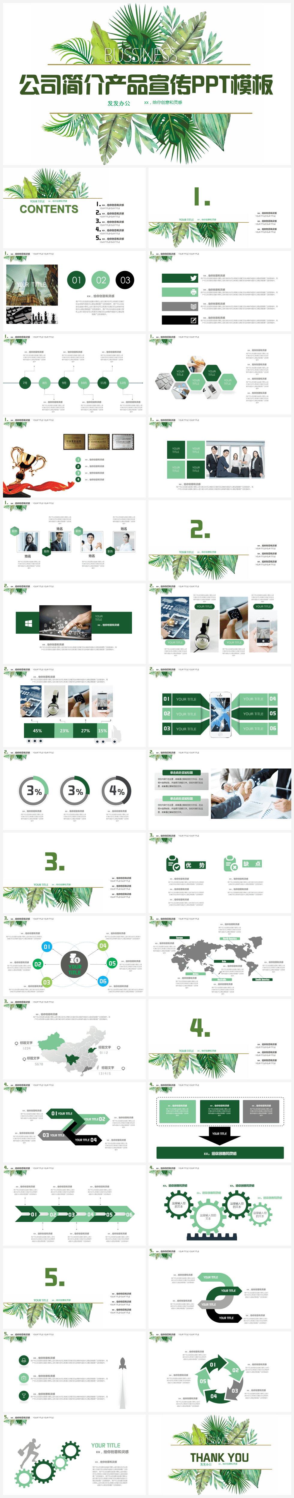 本作品内容为绿色简约风公司简介产品宣传PPT模板。 格式为 pptx, 大小6MB, 页数为33,比例自定义, 请使用软件PowerPoint打开, 作品中主体文字及图片可替换修改,文字修改可直接点击文本框进行编辑,图片更改可选中图片后单击鼠标右键选择更换图片,也可根据自身需求增加和删除作品中的内容, 源文件无水印, 欢迎使用发发资源库。 资源下载此资源下载价格为8.8F币,VIP免费,请先登录