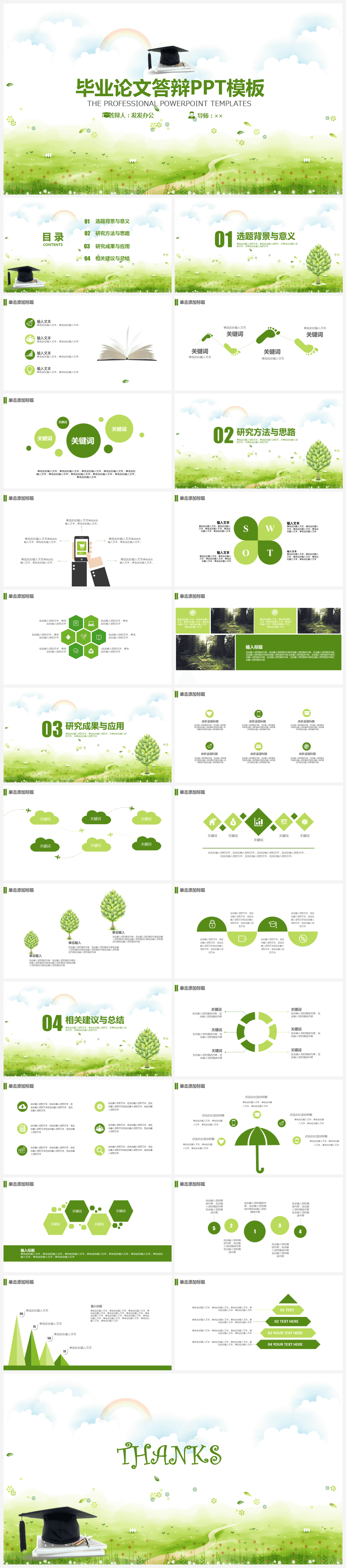 本作品内容为绿色小清新乡间小路毕业论文答辩PPT模板。 格式为 pptx, 大小4MB, 页数为26,比例自定义, 请使用软件PowerPoint打开, 作品中主体文字及图片可替换修改,文字修改可直接点击文本框进行编辑,图片更改可选中图片后单击鼠标右键选择更换图片,也可根据自身需求增加和删除作品中的内容, 源文件无水印, 欢迎使用发发资源库。