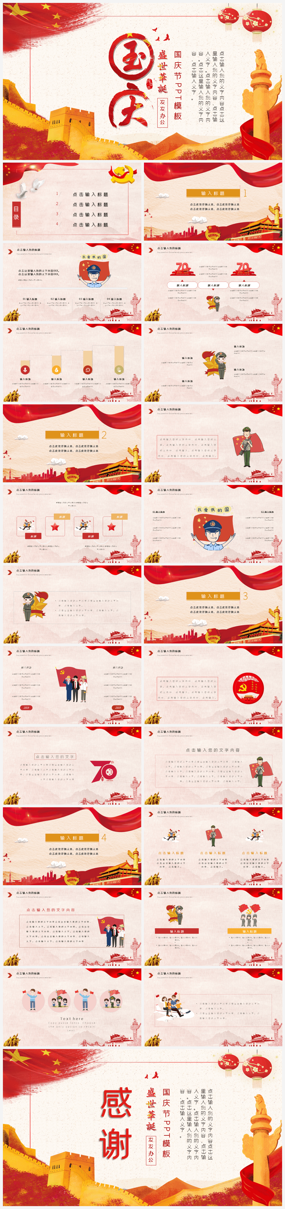 本作品内容为红色中国风国庆节通用PPT模板。 格式为 pptx, 大小18MB, 页数为24,比例自定义, 请使用软件PowerPoint打开, 作品中主体文字及图片可替换修改,文字修改可直接点击文本框进行编辑,图片更改可选中图片后单击鼠标右键选择更换图片,也可根据自身需求增加和删除作品中的内容, 源文件无水印, 欢迎使用发发资源库。