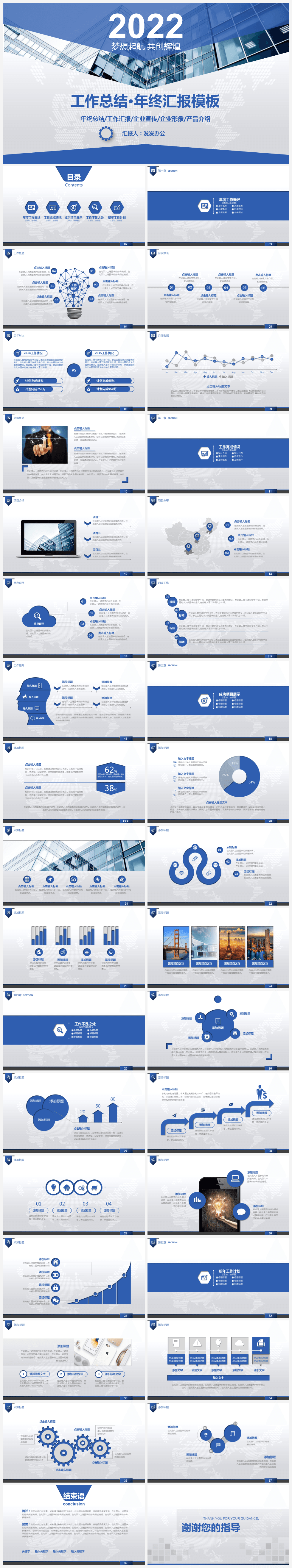 本作品内容为蓝色商务简约风工作总结年终汇报PPT模板。 格式为 pptx, 大小9MB, 页数为35,比例自定义, 请使用软件PowerPoint打开, 作品中主体文字及图片可替换修改,文字修改可直接点击文本框进行编辑,图片更改可选中图片后单击鼠标右键选择更换图片,也可根据自身需求增加和删除作品中的内容, 源文件无水印, 欢迎使用发发资源库。
