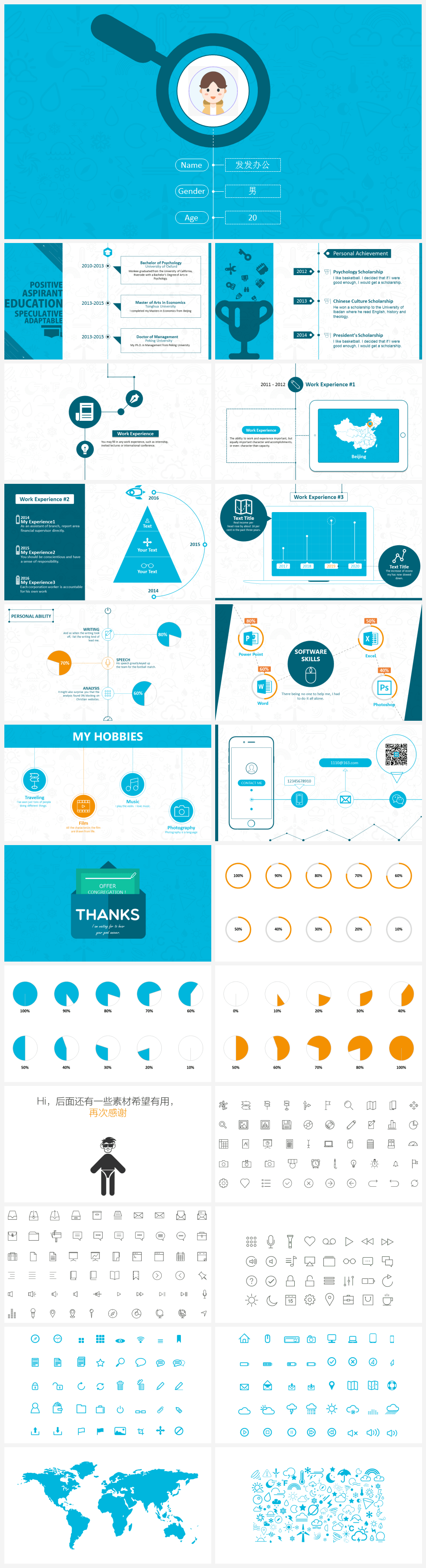 本作品内容为蓝色可爱风个人简历求职应聘PPT模板。 格式为 pptx, 大小2MB, 页数为23,比例自定义, 请使用软件PowerPoint打开, 作品中主体文字及图片可替换修改,文字修改可直接点击文本框进行编辑,图片更改可选中图片后单击鼠标右键选择更换图片,也可根据自身需求增加和删除作品中的内容, 源文件无水印, 欢迎使用发发资源库。