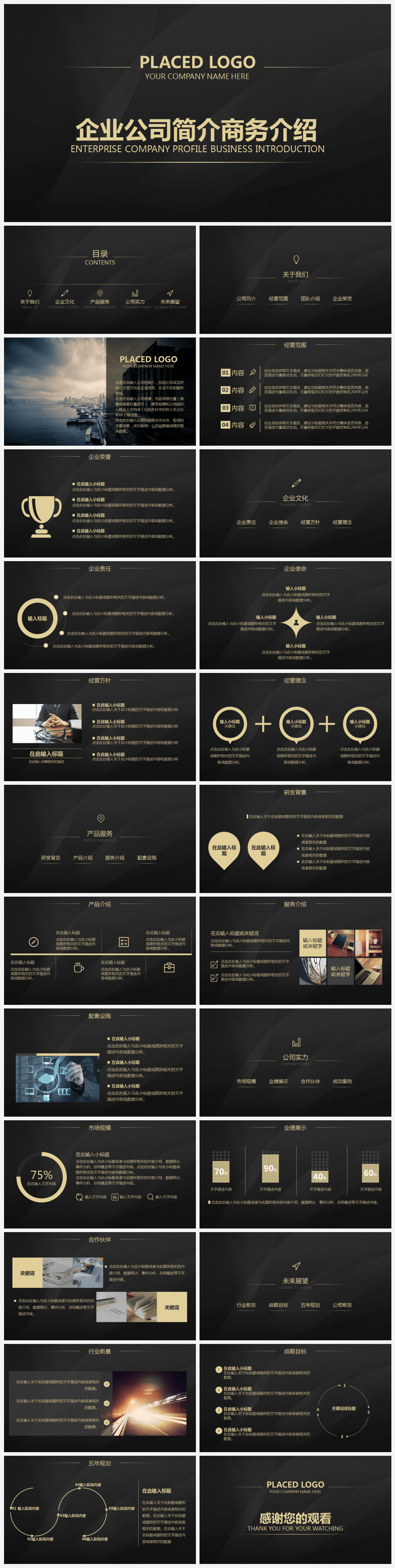 本作品内容为简约风高端企业公司简介商务介绍PPT模板。 格式为 pptx, 大小6MB, 页数为25,比例自定义, 请使用软件PowerPoint打开, 作品中主体文字及图片可替换修改,文字修改可直接点击文本框进行编辑,图片更改可选中图片后单击鼠标右键选择更换图片,也可根据自身需求增加和删除作品中的内容, 源文件无水印, 欢迎使用发发资源库。 资源下载此资源下载价格为8.8F币,VIP免费,请先登录
