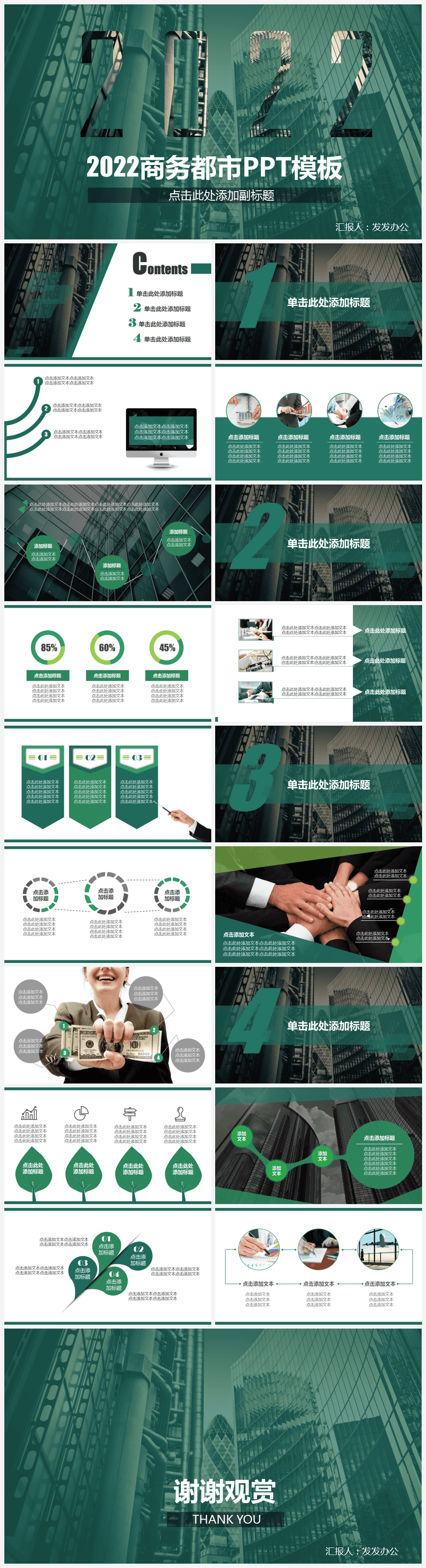 本作品内容为2022墨绿色商务都市产品介绍通用PPT模板。 格式为 pptx, 大小8MB, 页数为20,比例16:9, 请使用软件PowerPoint打开, 作品中主体文字及图片可替换修改,文字修改可直接点击文本框进行编辑,图片更改可选中图片后单击鼠标右键选择更换图片,也可根据自身需求增加和删除作品中的内容, 源文件无水印, 欢迎使用发发资源库。