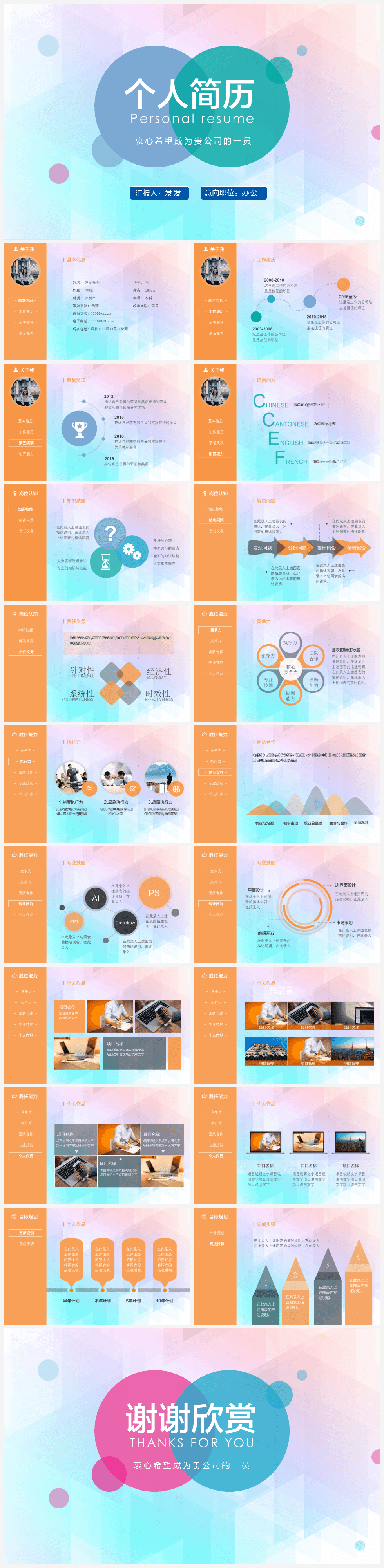 本作品内容为橙色简约风多彩圆圈岗位竞聘个人简历PPT模板。 格式为 pptx, 大小16MB, 页数为20,比例16:10, 请使用软件PowerPoint打开, 作品中主体文字及图片可替换修改,文字修改可直接点击文本框进行编辑,图片更改可选中图片后单击鼠标右键选择更换图片,也可根据自身需求增加和删除作品中的内容, 源文件无水印, 欢迎使用发发资源库。