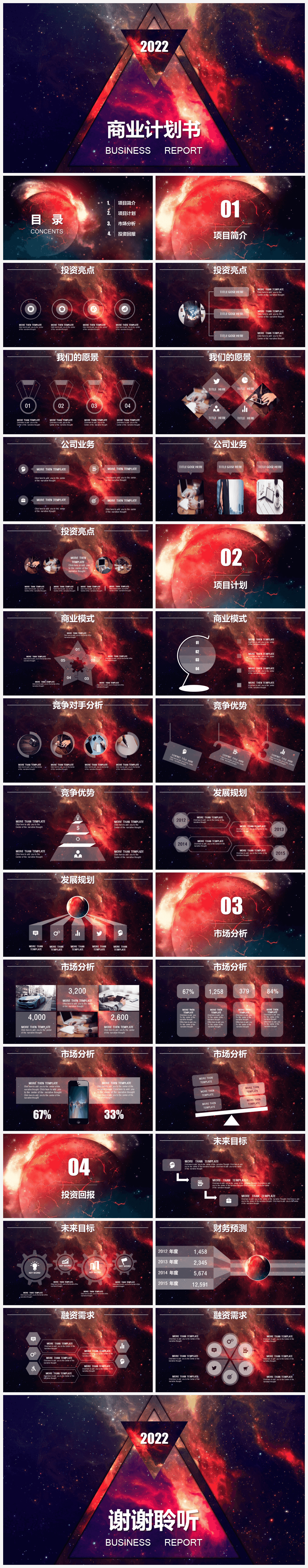 本作品内容为欧美风炫彩宇宙星球星空商业计划书PPT模板。 格式为 pptx, 大小3MB, 页数为30,比例自定义, 请使用软件PowerPoint打开, 作品中主体文字及图片可替换修改,文字修改可直接点击文本框进行编辑,图片更改可选中图片后单击鼠标右键选择更换图片,也可根据自身需求增加和删除作品中的内容, 源文件无水印, 欢迎使用发发资源库。