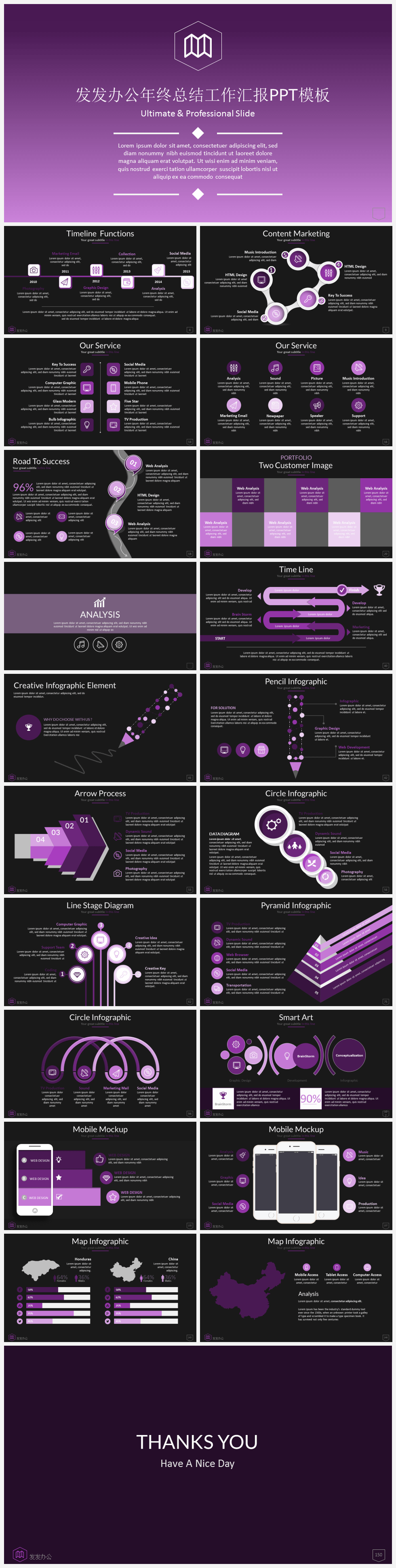 本作品内容为紫黑色欧美风扁平化年终总结工作汇报PPT模板。 格式为 pptx, 大小18MB, 页数为150,比例自定义, 请使用软件PowerPoint打开, 作品中主体文字及图片可替换修改,文字修改可直接点击文本框进行编辑,图片更改可选中图片后单击鼠标右键选择更换图片,也可根据自身需求增加和删除作品中的内容, 源文件无水印, 欢迎使用发发资源库。