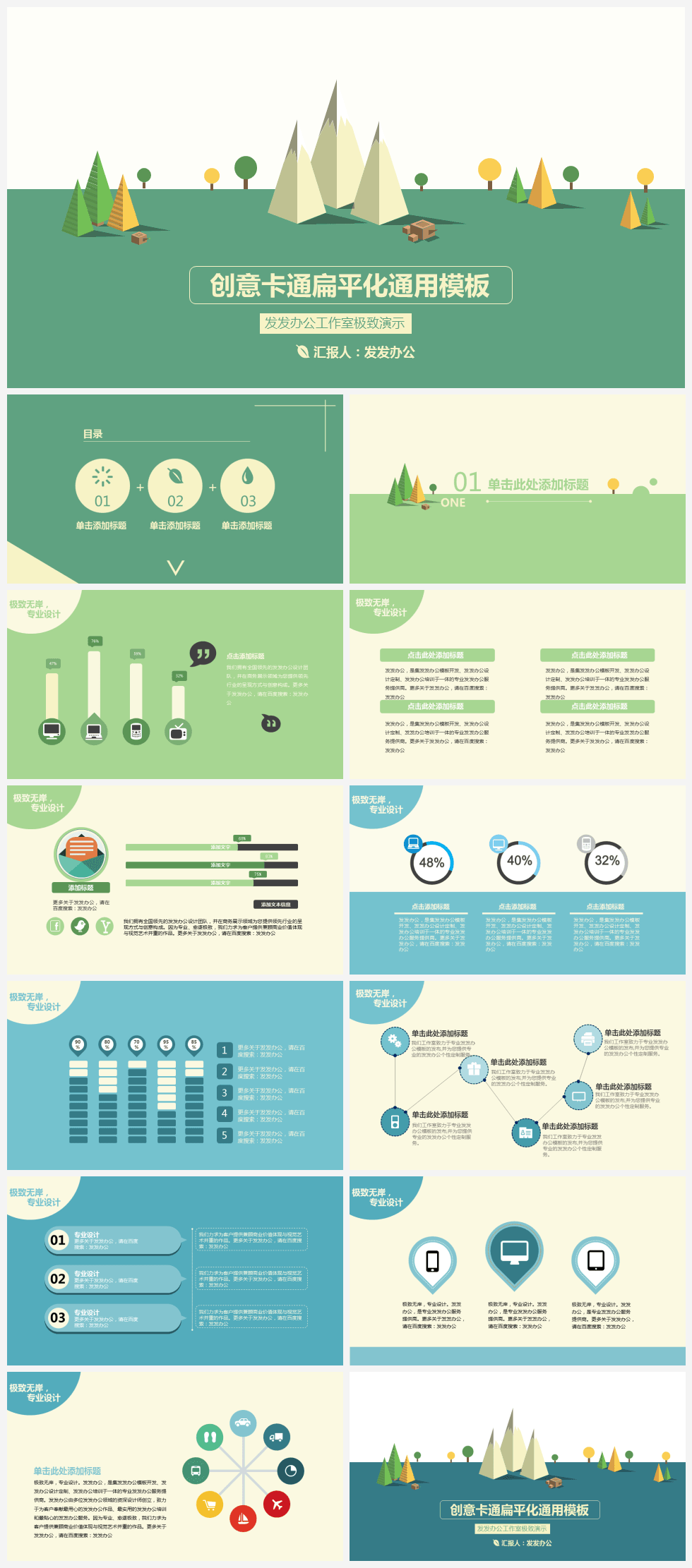 本作品内容为创意卡通扁平化通用PPT模板。 格式为 pptx, 大小1MB, 页数为13,比例自定义, 请使用软件PowerPoint打开, 作品中主体文字及图片可替换修改,文字修改可直接点击文本框进行编辑,图片更改可选中图片后单击鼠标右键选择更换图片,也可根据自身需求增加和删除作品中的内容, 源文件无水印, 欢迎使用发发资源库。
