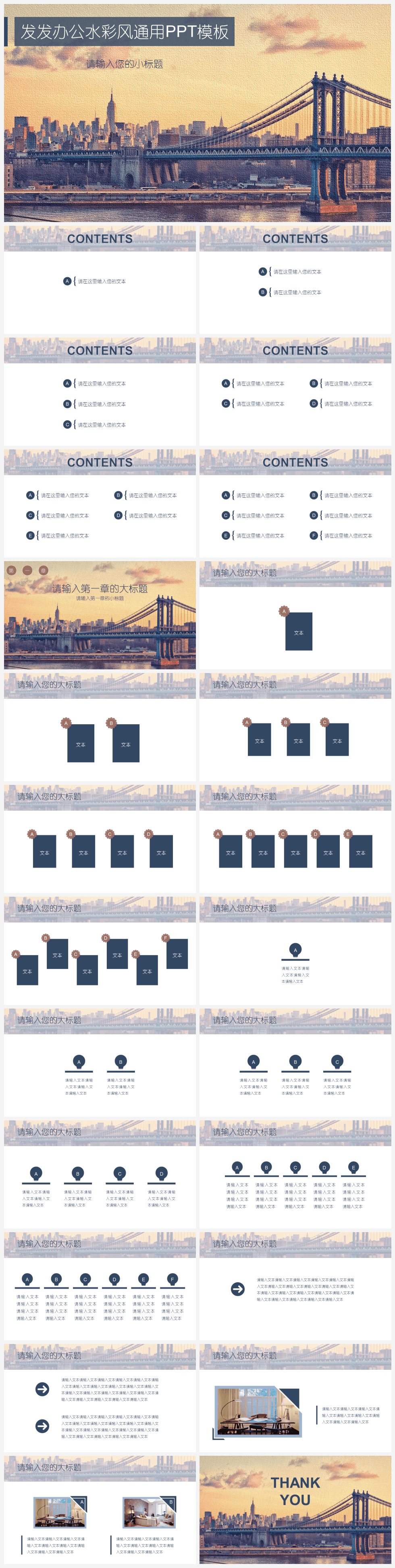 本作品内容为水彩风简约通用PPT模板。 格式为 pptx, 大小5MB, 页数为25,比例自定义, 请使用软件PowerPoint打开, 作品中主体文字及图片可替换修改,文字修改可直接点击文本框进行编辑,图片更改可选中图片后单击鼠标右键选择更换图片,也可根据自身需求增加和删除作品中的内容, 源文件无水印, 欢迎使用发发资源库。