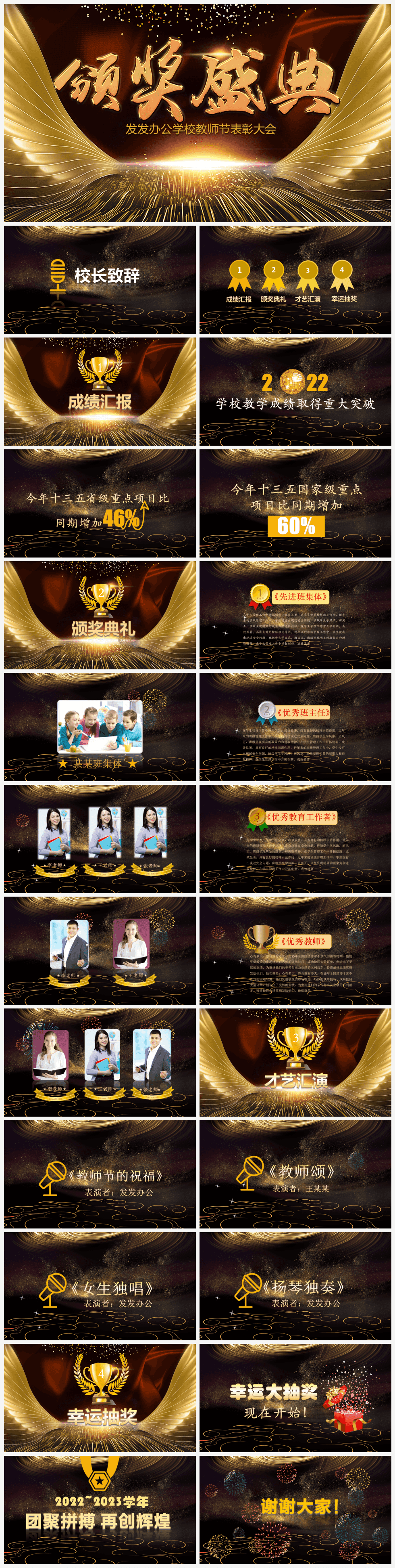 本作品内容为大气金色天使学校教师节表彰大会颁奖盛典PPT模板。 格式为 pptx, 大小12MB, 页数为25,比例自定义, 请使用软件PowerPoint打开, 作品中主体文字及图片可替换修改,文字修改可直接点击文本框进行编辑,图片更改可选中图片后单击鼠标右键选择更换图片,也可根据自身需求增加和删除作品中的内容, 源文件无水印, 欢迎使用发发资源库。 资源下载此资源下载价格为8.8F币,VIP免费,请先登录
