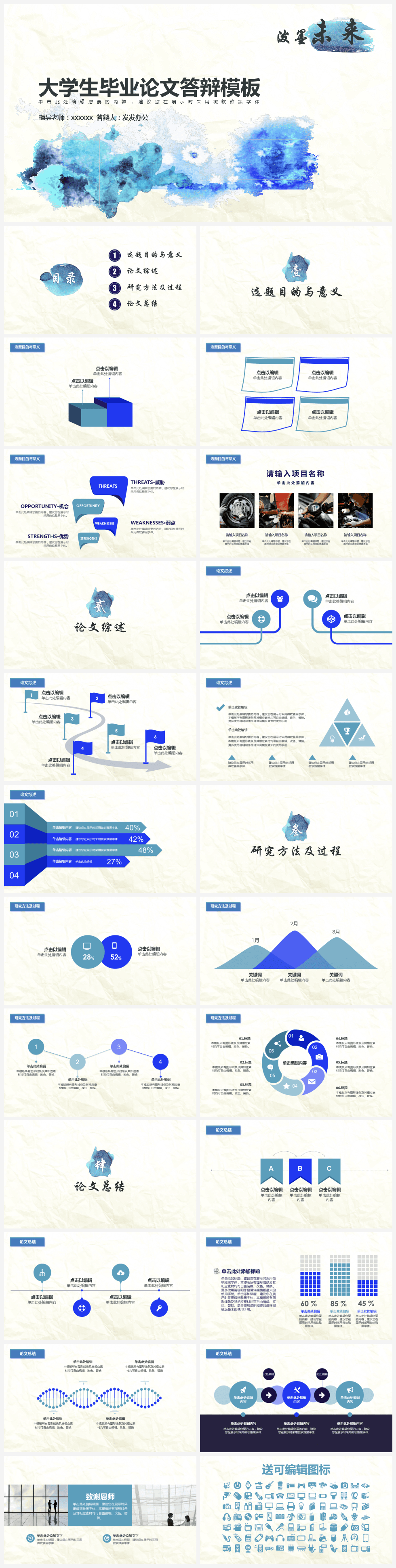 本作品内容为蓝色泼墨未来大学生毕业论文答辩PPT模板。 格式为 pptx, 大小8MB, 页数为25,比例自定义, 请使用软件PowerPoint打开, 作品中主体文字及图片可替换修改,文字修改可直接点击文本框进行编辑,图片更改可选中图片后单击鼠标右键选择更换图片,也可根据自身需求增加和删除作品中的内容, 源文件无水印, 欢迎使用发发资源库。