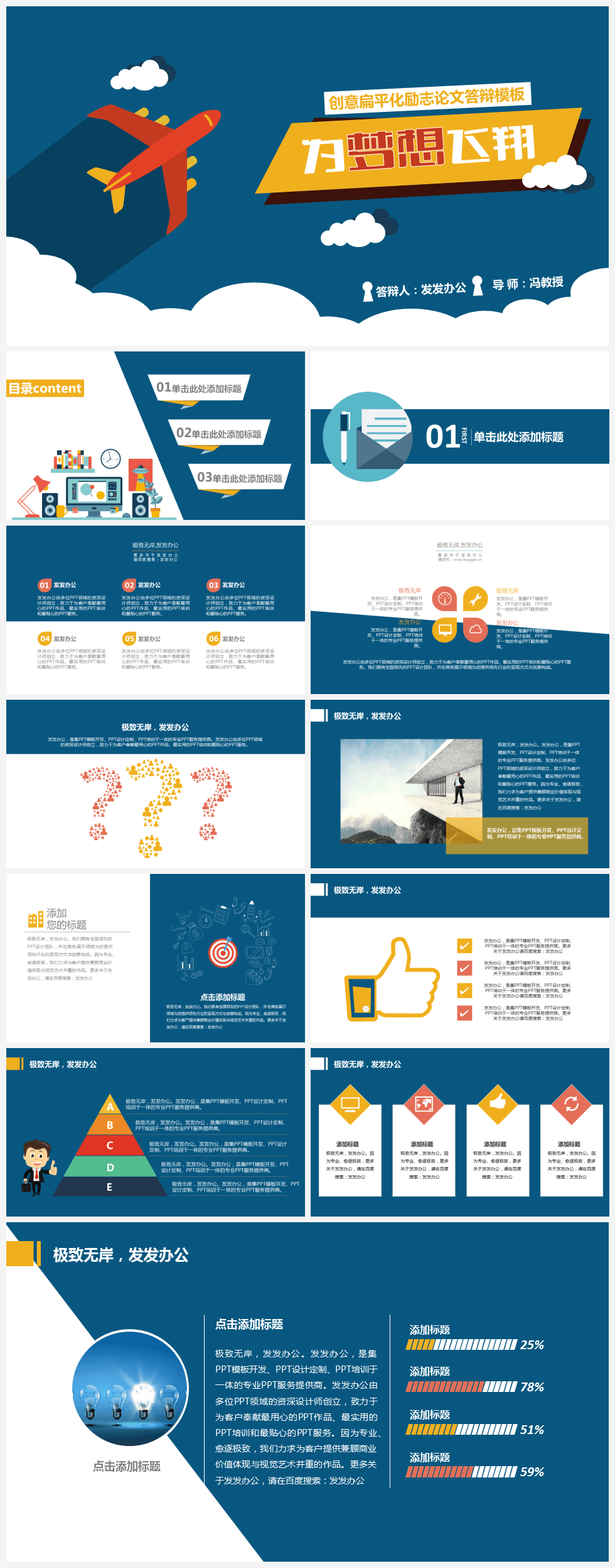 本作品内容为蓝色卡通风创意扁平化励志论文答辩PPT模板。 格式为 pptx, 大小2MB, 页数为12,比例自定义, 请使用软件PowerPoint打开, 作品中主体文字及图片可替换修改,文字修改可直接点击文本框进行编辑,图片更改可选中图片后单击鼠标右键选择更换图片,也可根据自身需求增加和删除作品中的内容, 源文件无水印, 欢迎使用发发资源库。