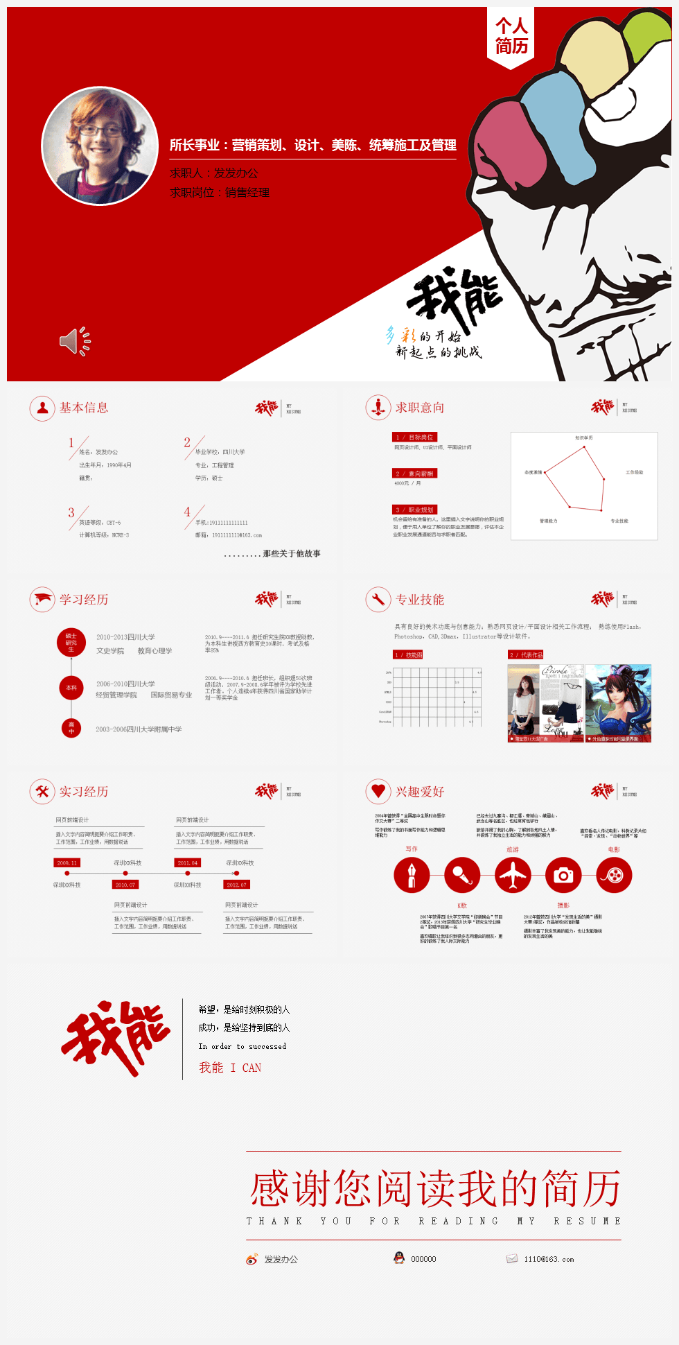 本作品内容为红色简约风我能个人简历岗位求职PPT模板。 格式为 pptx, 大小4MB, 页数为8,比例自定义, 请使用软件PowerPoint打开, 作品中主体文字及图片可替换修改,文字修改可直接点击文本框进行编辑,图片更改可选中图片后单击鼠标右键选择更换图片,也可根据自身需求增加和删除作品中的内容, 源文件无水印, 欢迎使用发发资源库。 资源下载此资源下载价格为8.8F币,VIP免费,请先登录