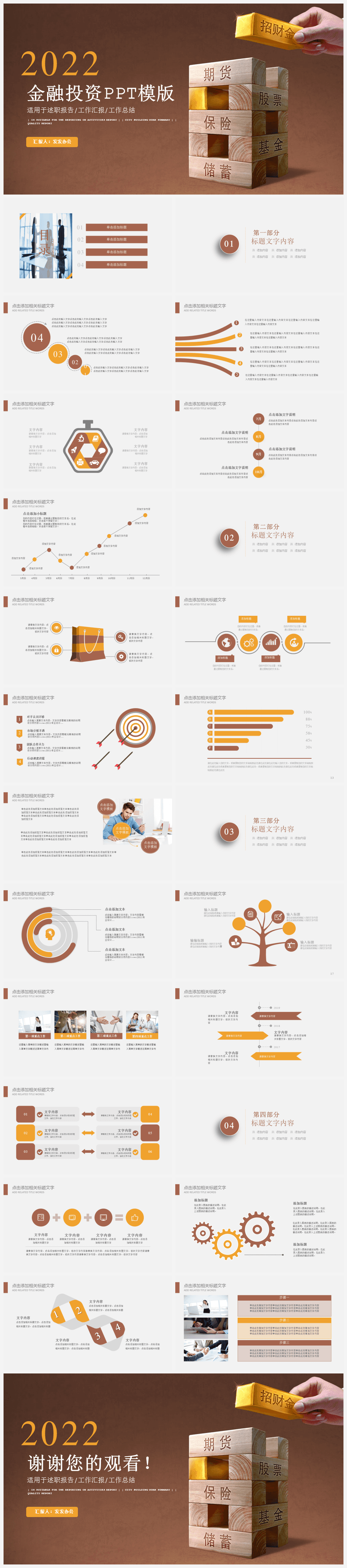 本作品内容为棕色简约风金融投资述职汇报PPT模板。 格式为 pptx, 大小86MB, 页数为26,比例16:9, 请使用软件PowerPoint打开, 作品中主体文字及图片可替换修改,文字修改可直接点击文本框进行编辑,图片更改可选中图片后单击鼠标右键选择更换图片,也可根据自身需求增加和删除作品中的内容, 源文件无水印, 欢迎使用发发资源库。 资源下载此资源下载价格为8.8F币,VIP免费,请先登录