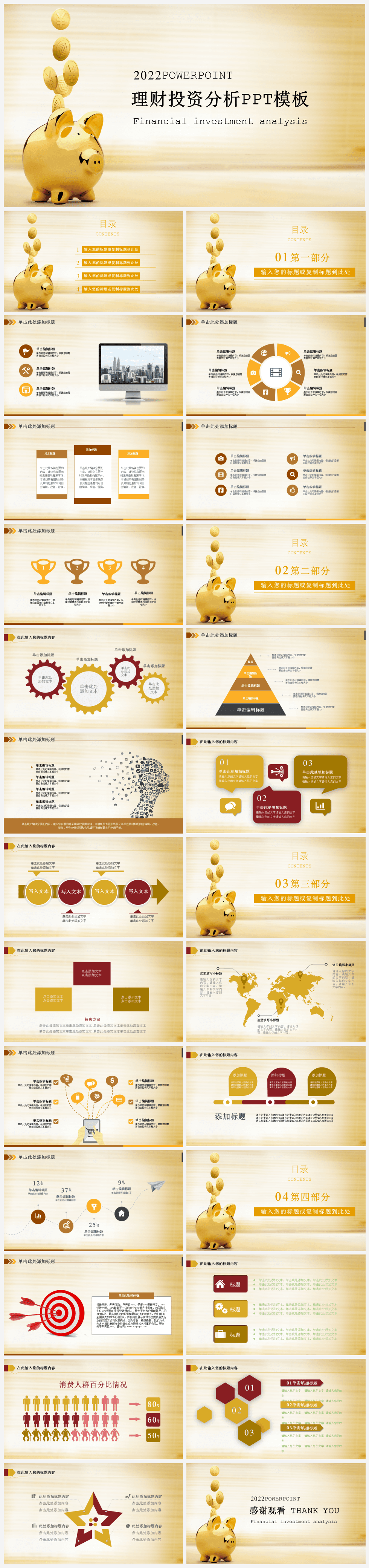 本作品内容为金色简约风理财投资分析PPT模板。 格式为 pptx, 大小21MB, 页数为27,比例16:9, 请使用软件PowerPoint打开, 作品中主体文字及图片可替换修改,文字修改可直接点击文本框进行编辑,图片更改可选中图片后单击鼠标右键选择更换图片,也可根据自身需求增加和删除作品中的内容, 源文件无水印, 欢迎使用发发资源库。
