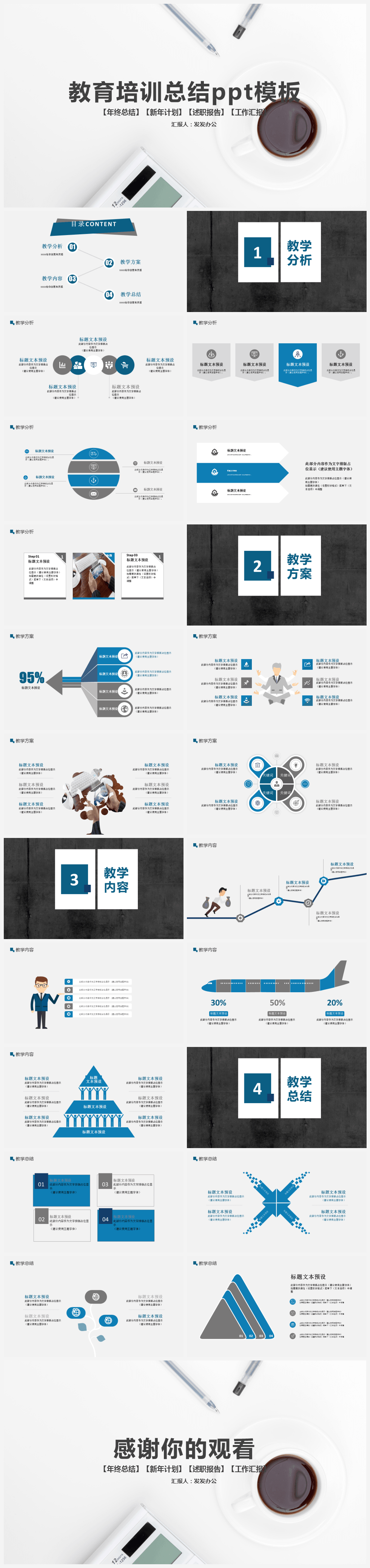 本作品内容为大气蓝色简约风教育培训总结PPT模板。 格式为 pptx, 大小22MB, 页数为24,比例16:9, 请使用软件PowerPoint打开, 作品中主体文字及图片可替换修改,文字修改可直接点击文本框进行编辑,图片更改可选中图片后单击鼠标右键选择更换图片,也可根据自身需求增加和删除作品中的内容, 源文件无水印, 欢迎使用发发资源库。 资源下载此资源下载价格为8.8F币,VIP免费,请先登录