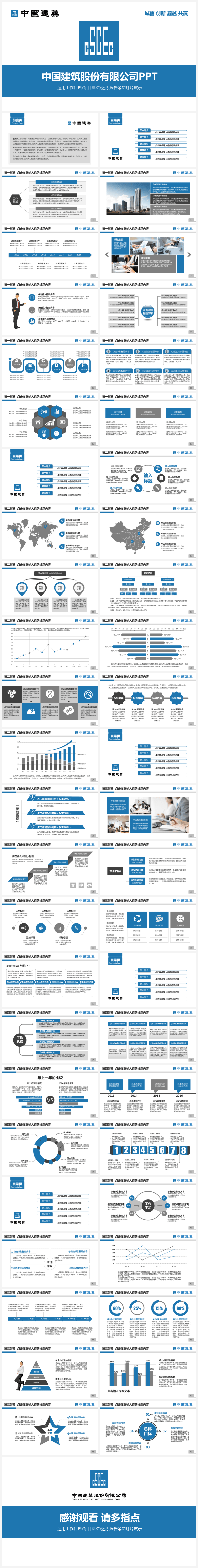 本作品内容为大气蓝色欧美风中国建筑公司述职报告项目总结PPT模板。 格式为 pptx, 大小5MB, 页数为50,比例自定义, 请使用软件PowerPoint打开, 作品中主体文字及图片可替换修改,文字修改可直接点击文本框进行编辑,图片更改可选中图片后单击鼠标右键选择更换图片,也可根据自身需求增加和删除作品中的内容, 源文件无水印, 欢迎使用发发资源库。